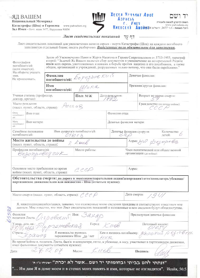 Бородянский Шика 1880 Киев, Украина (СССР) Лист свидетельских показаний