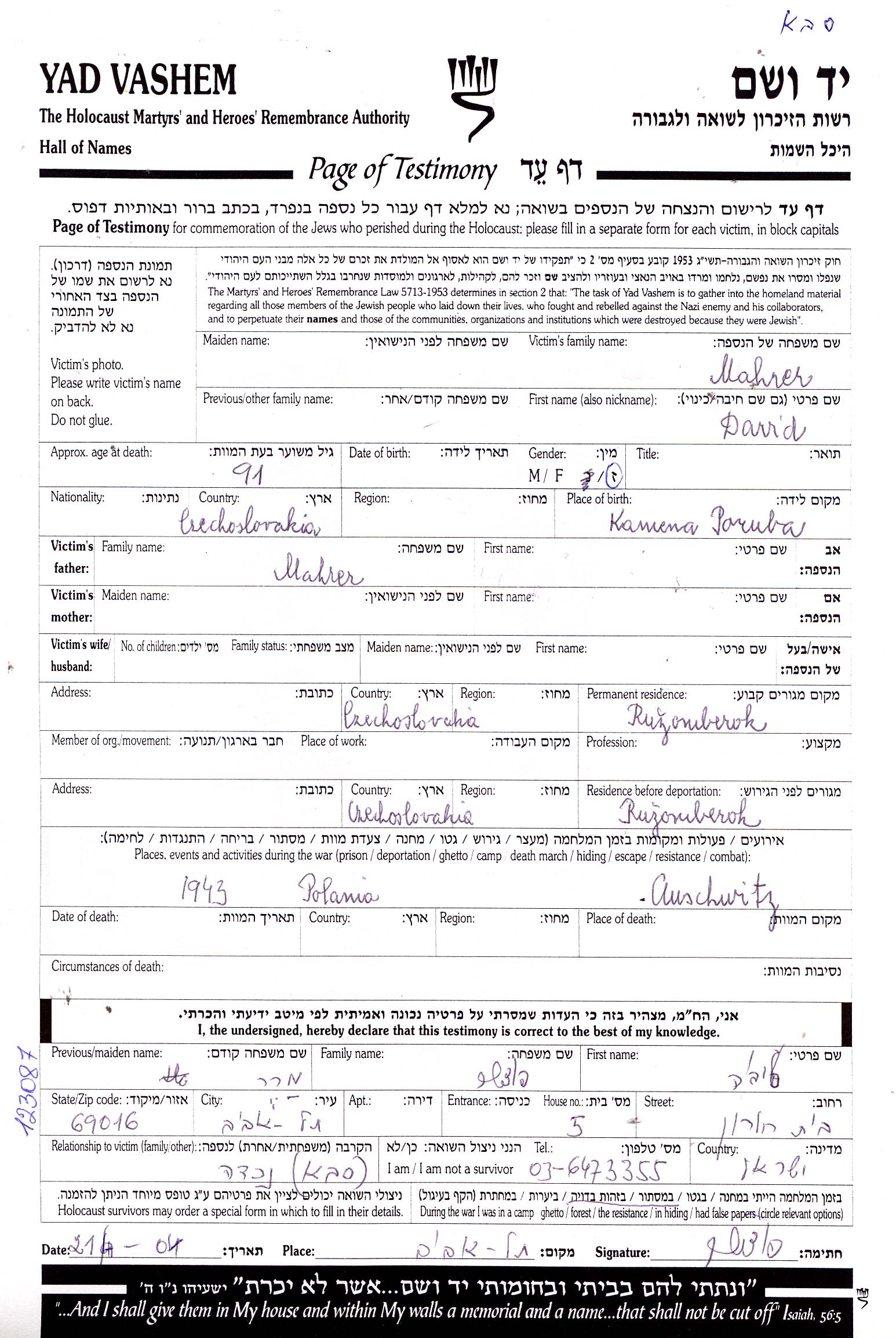 Марер Давид Ружомберок, Чехословакия Лист свидетельских показаний