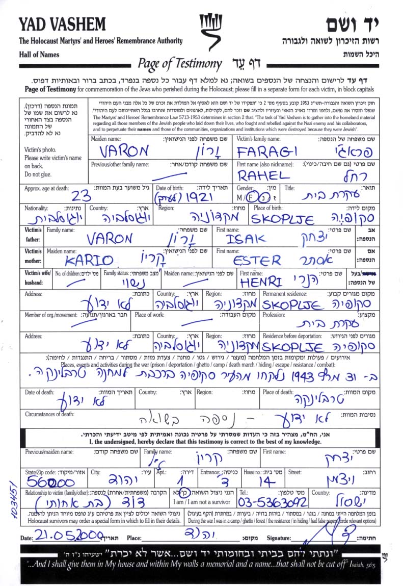 Фарагги Рашела Скопье, Югославия Лист свидетельских показаний