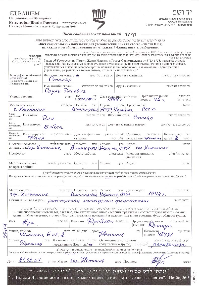 Столяр Сруль 1899 Хмельник, Украина (СССР) Лист свидетельских показаний