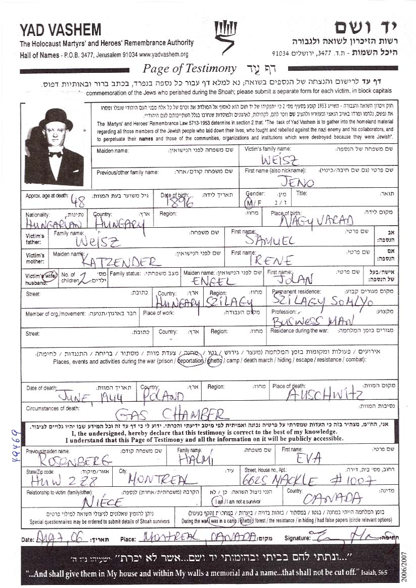 Ено Вейс, место рождения: Коаш, Румыния. Предприниматель. Место жительства до войны: Орадя, Румыния.