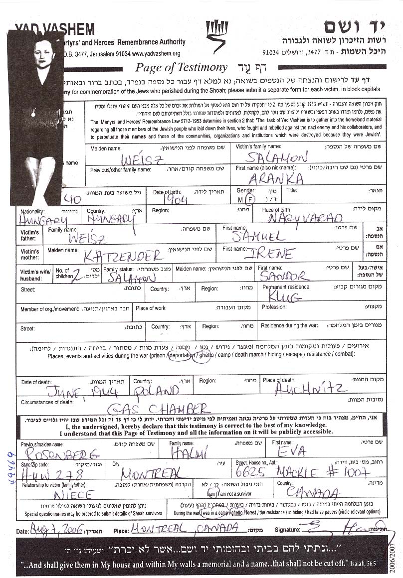 Аранка Саламон Шаламон, девичья фамилия Вейс, место рождения: Коаш, Румыния. Место жительства до войны: Орадя, Румыния.