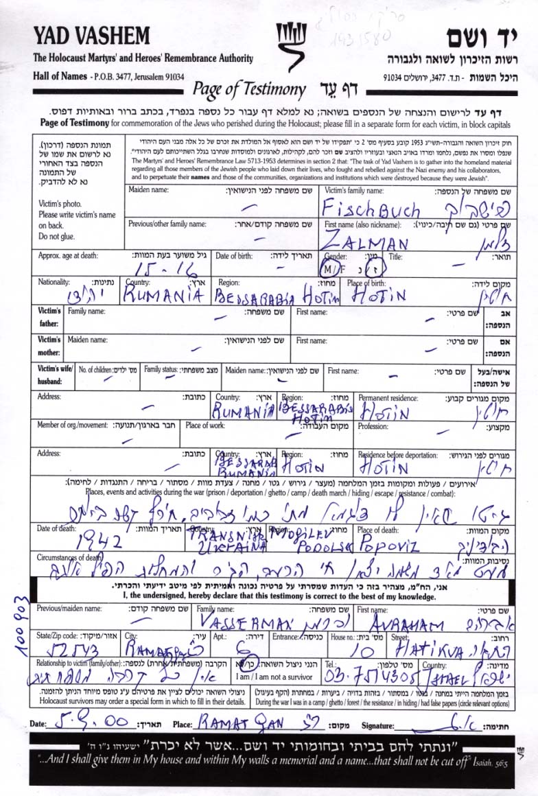 | Фишбух | Залман | Хотин, Румыния | Лист свидетельских показаний |