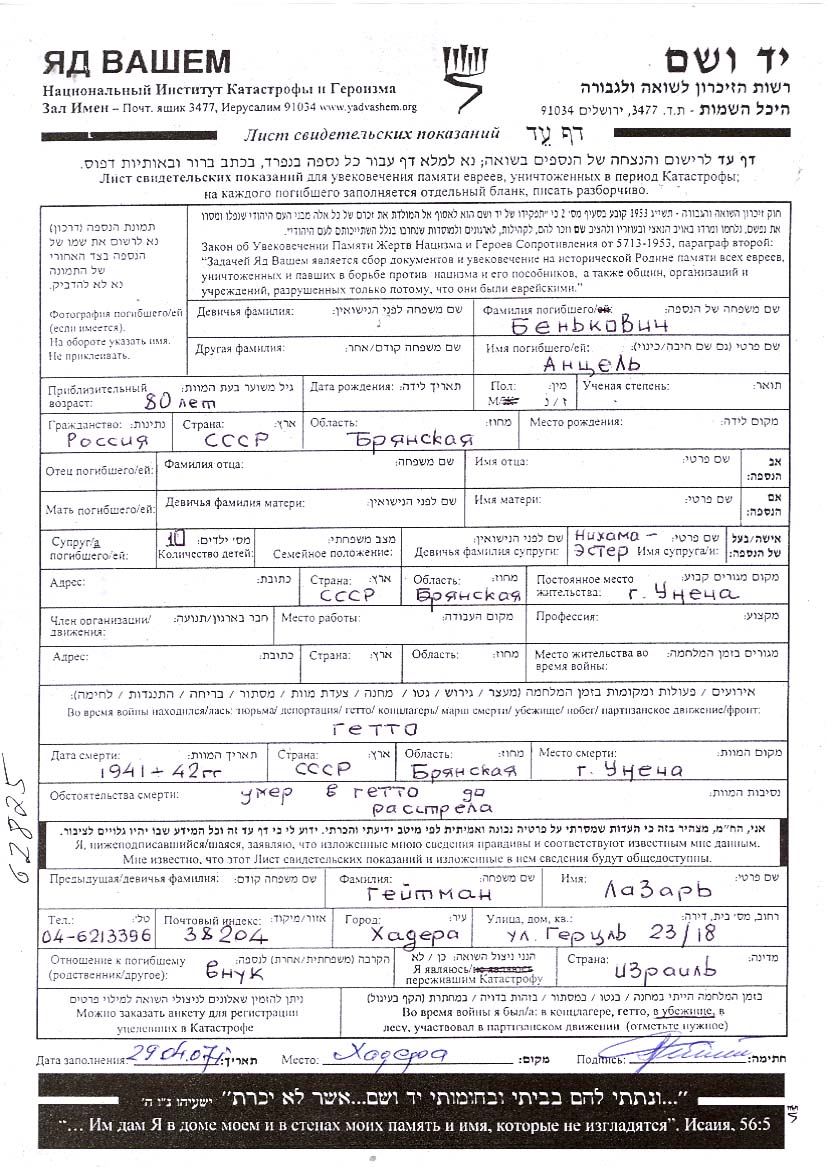 Бенькович Анцель Унеча, Россия (СССР) Лист свидетельских показаний