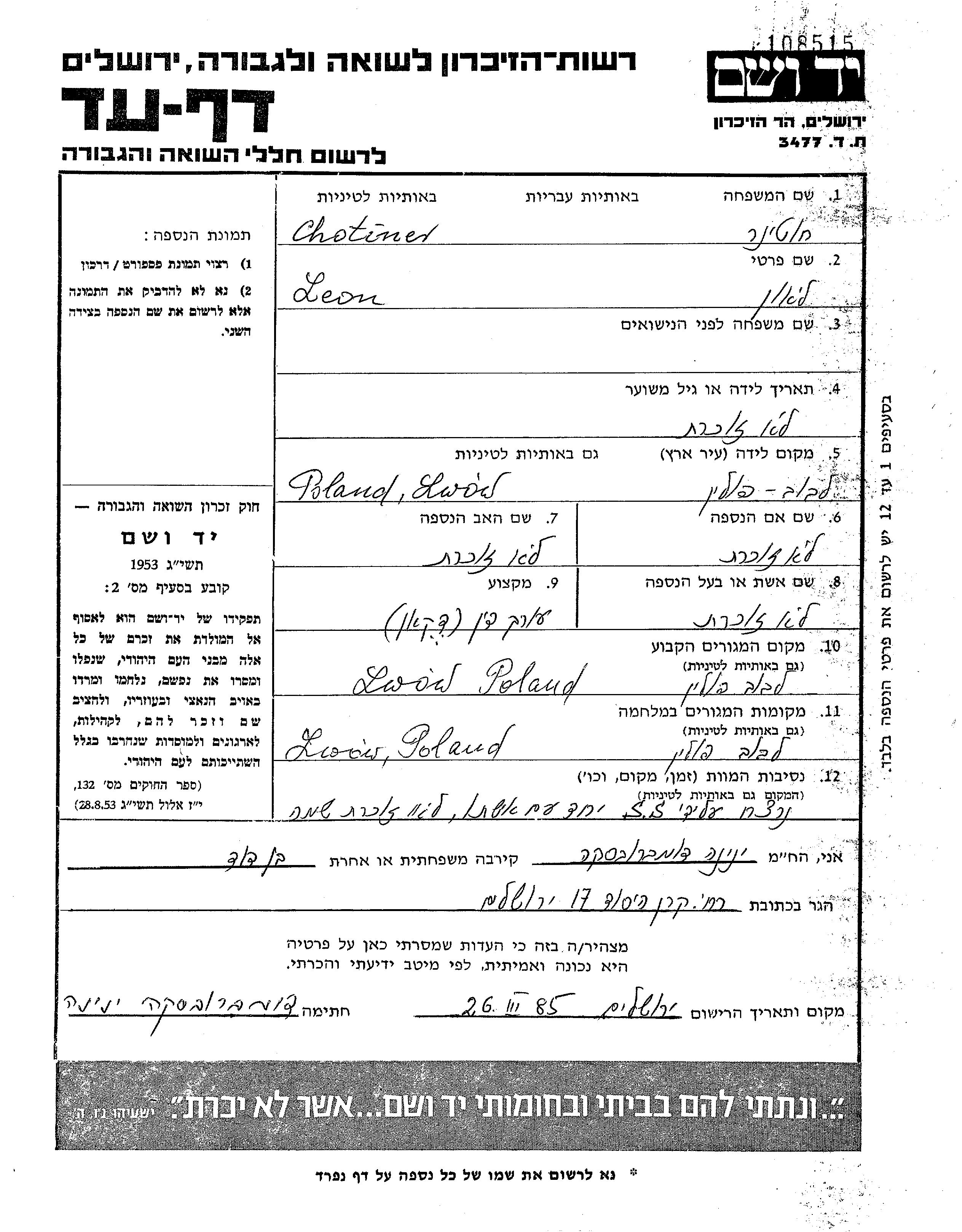Леон Хутинер, место рождения: Галиция, Польша. Адвокат. Место жительства до войны: Львов, Польша.