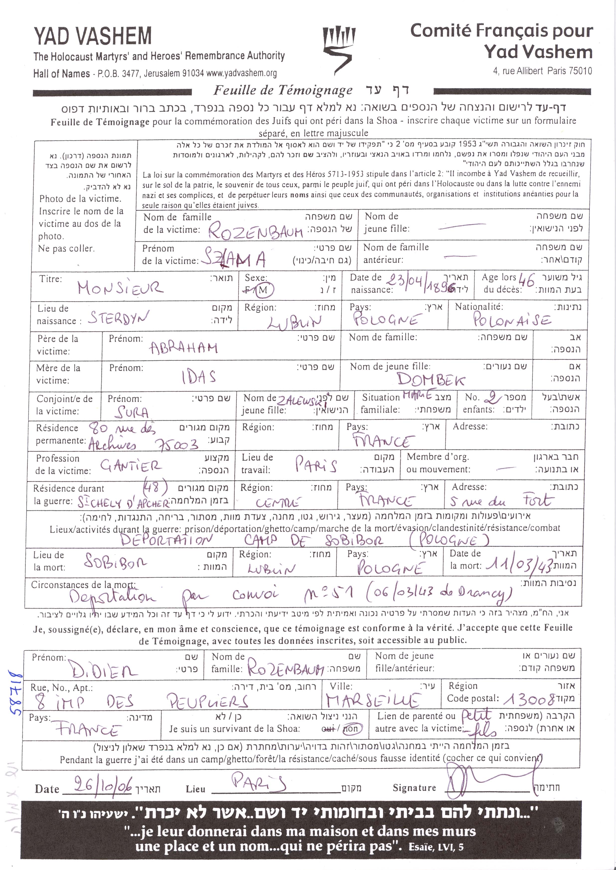 Шломо Розенбойм, место рождения: Стердынь, Польша. Место жительства до войны: Париж, Франция.