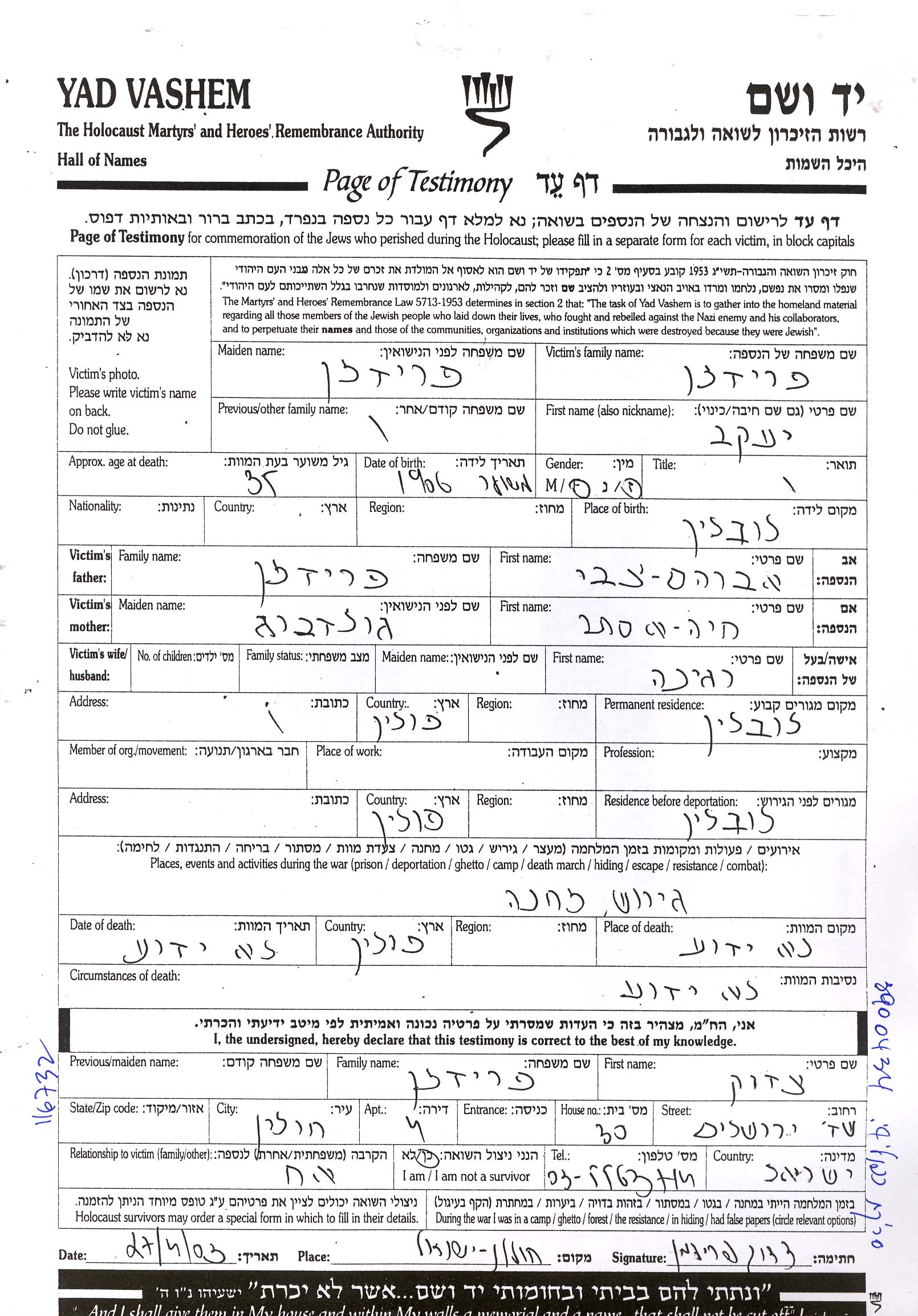 Фридман Якоб 1908 Люблин, Польша Лист свидетельских показаний