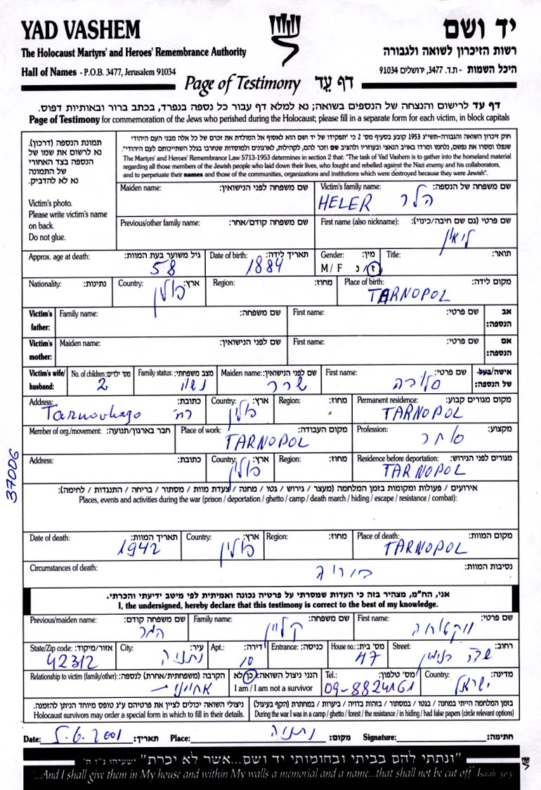Яд Вашем - Листы свидетельских показаний Мемориального фонда