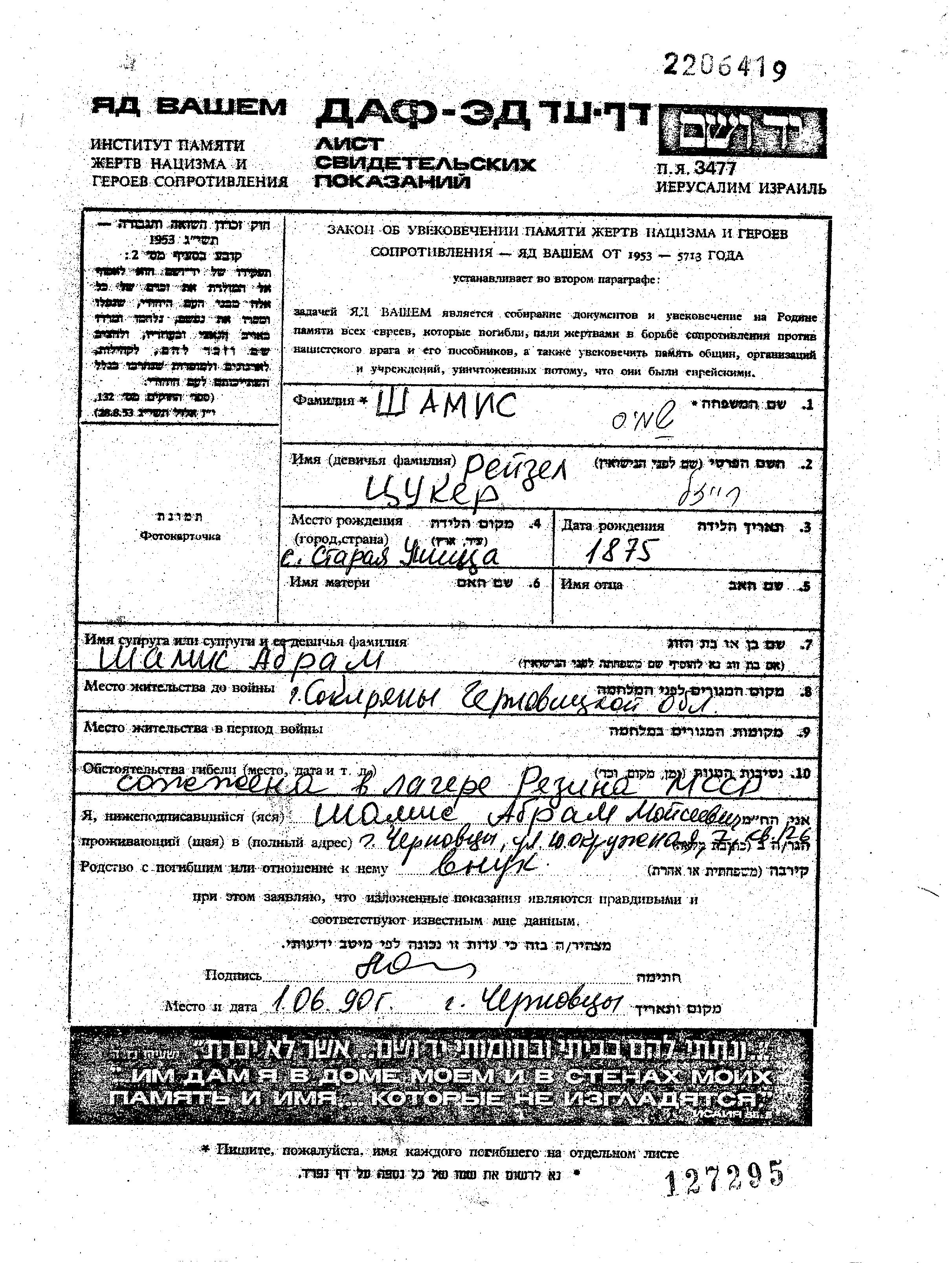 Шамис Рейзл 1875 место не указано, Лист свидетельских показаний