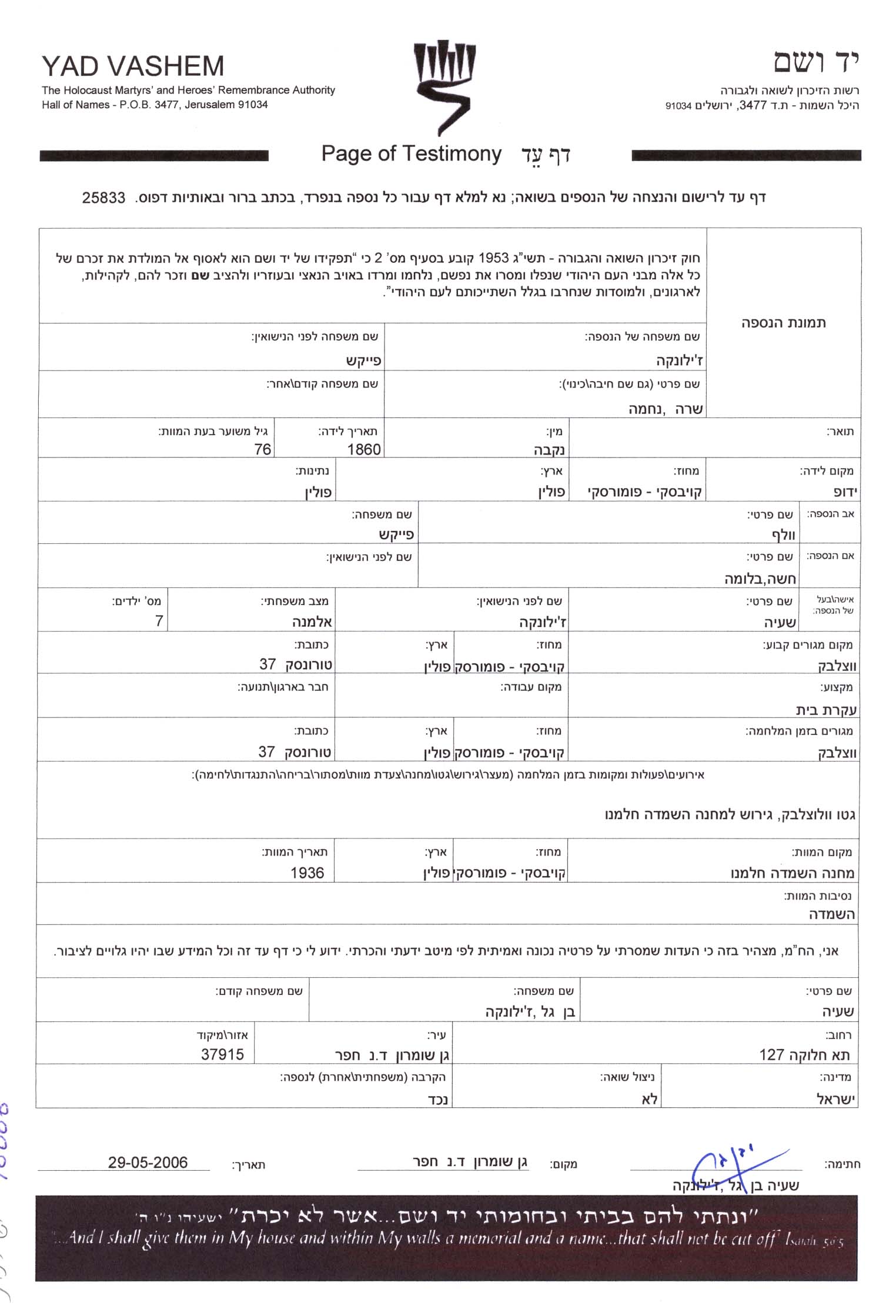 Желёнка | Сара Нехама | 1860 | Влоцлавек, Польша | Лист свидетельских показаний |