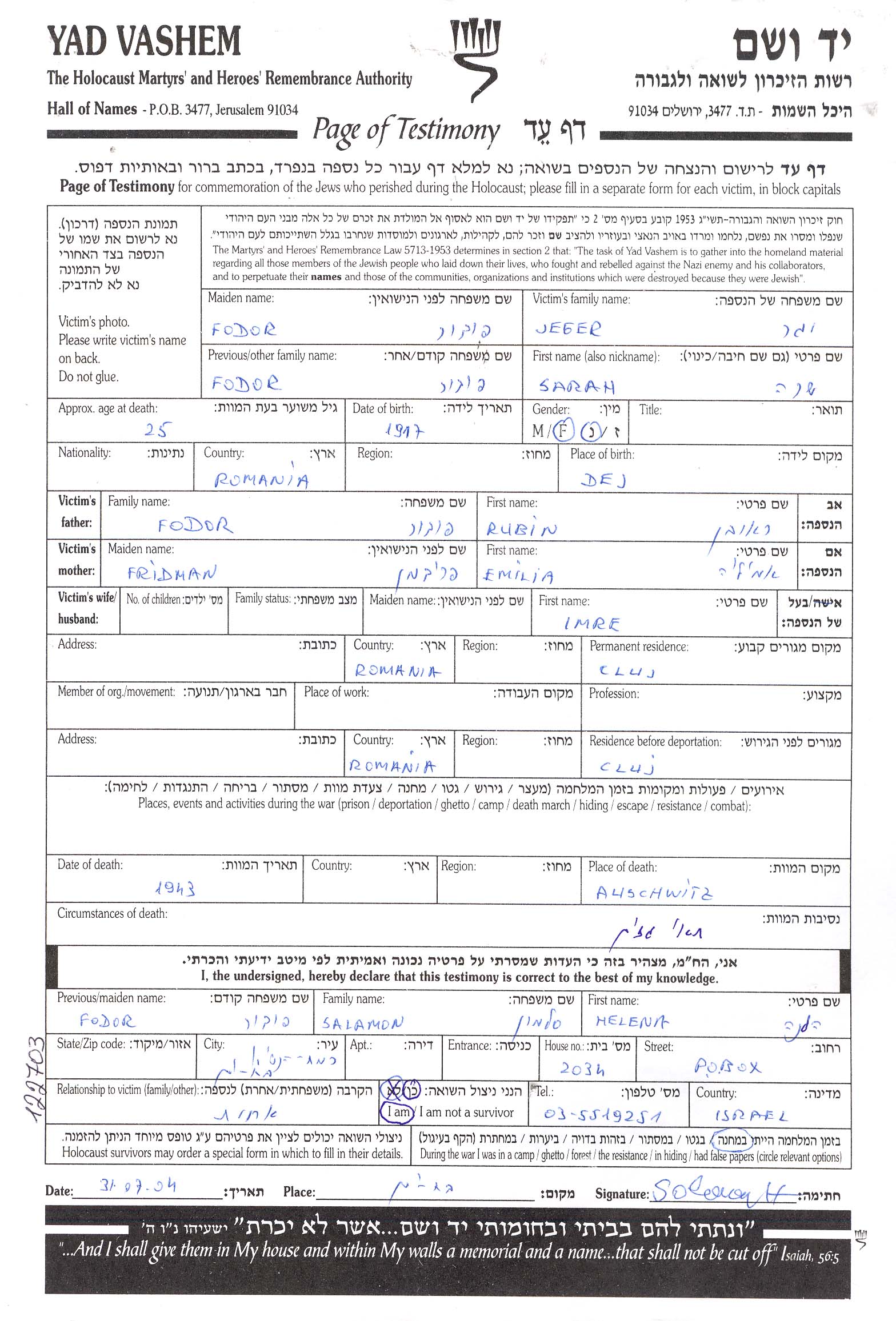 Яд Вашем - Листы свидетельских показаний Мемориального фонда
