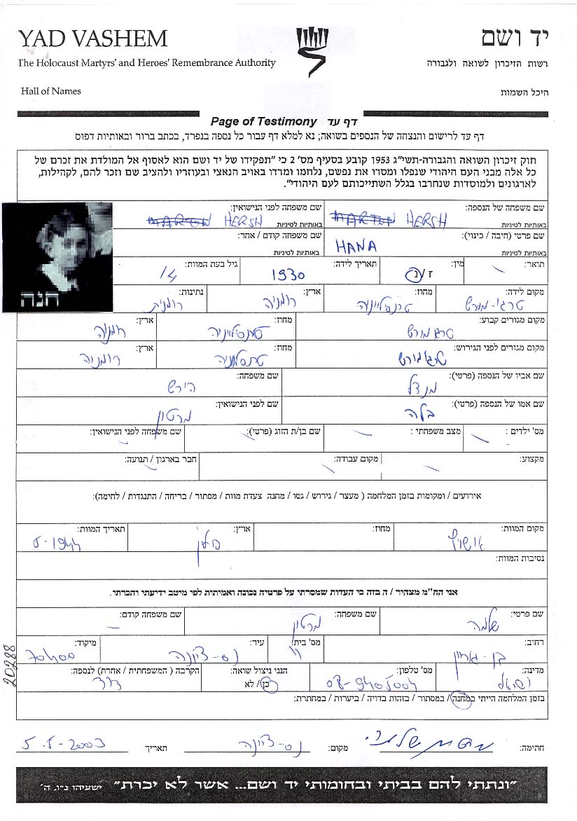 Хирш Хана 1928 Тыргу-Муреш, Румыния Лист свидетельских показаний