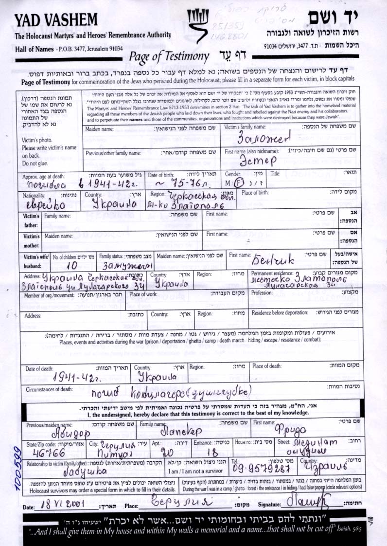 Яд Вашем - Листы свидетельских показаний Мемориального фонда