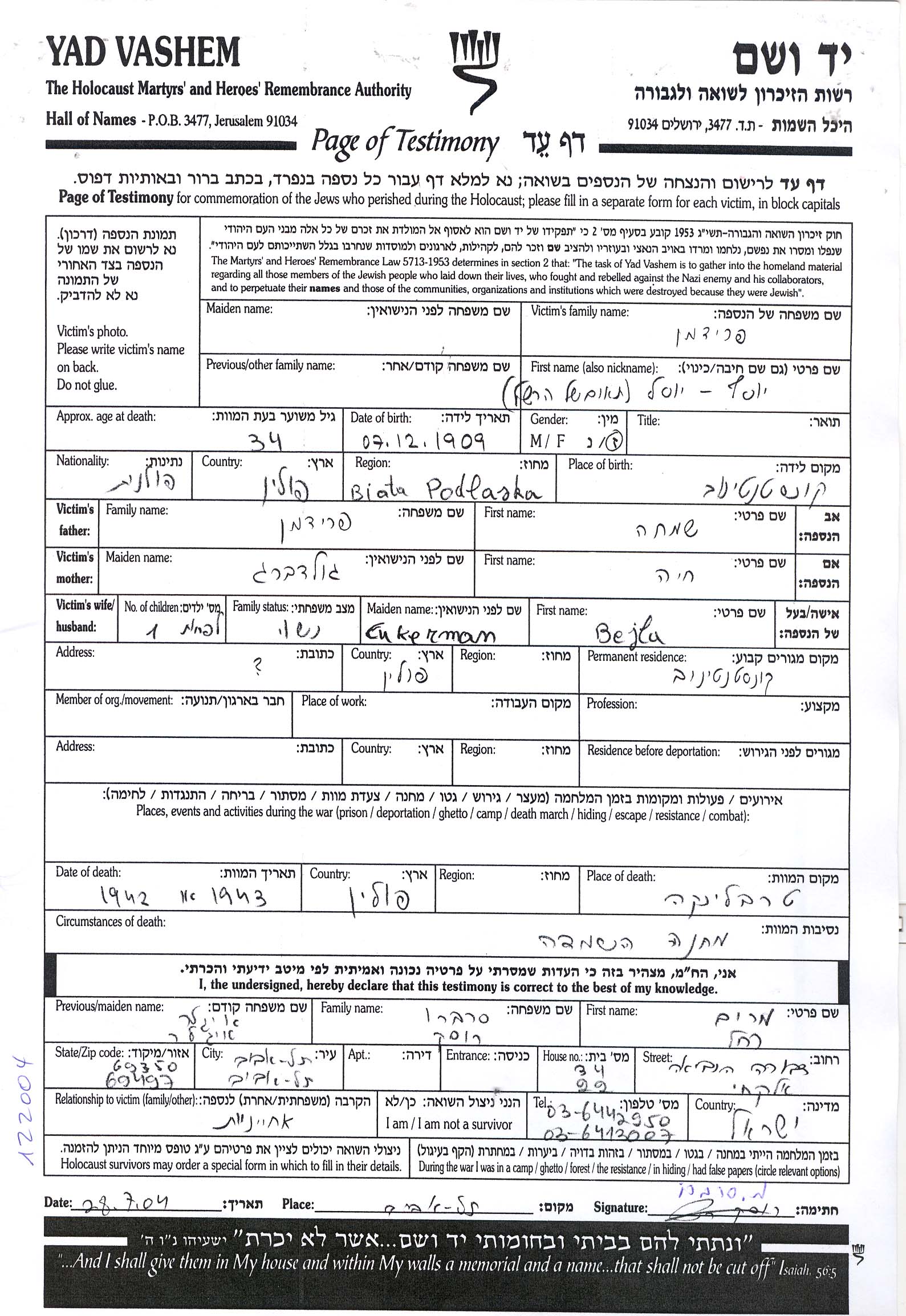 Яд Вашем - Листы свидетельских показаний Мемориального фонда