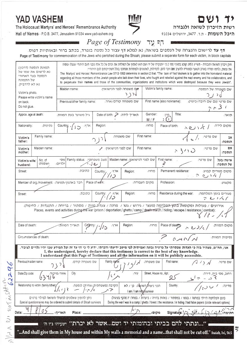 Яд Вашем - Листы свидетельских показаний Мемориального фонда