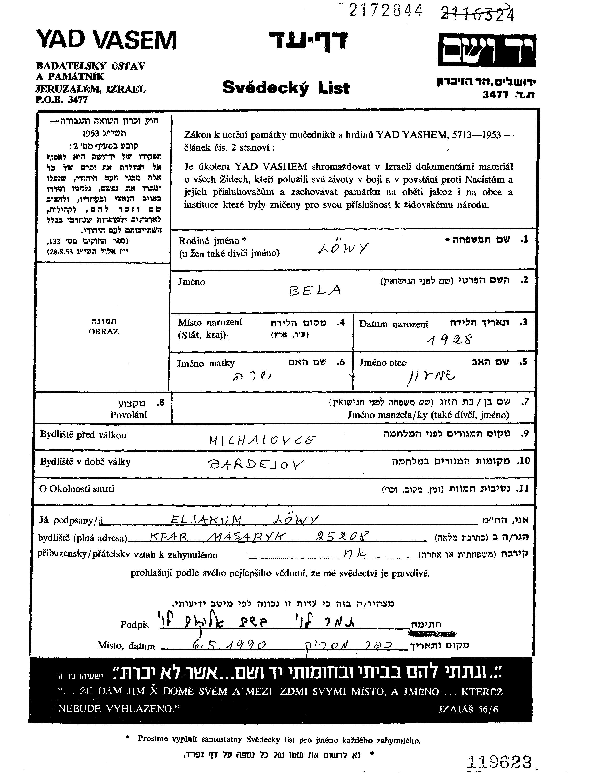 Лёви Бела 1928 Михаловце, Чехословакия Лист свидетельских показаний