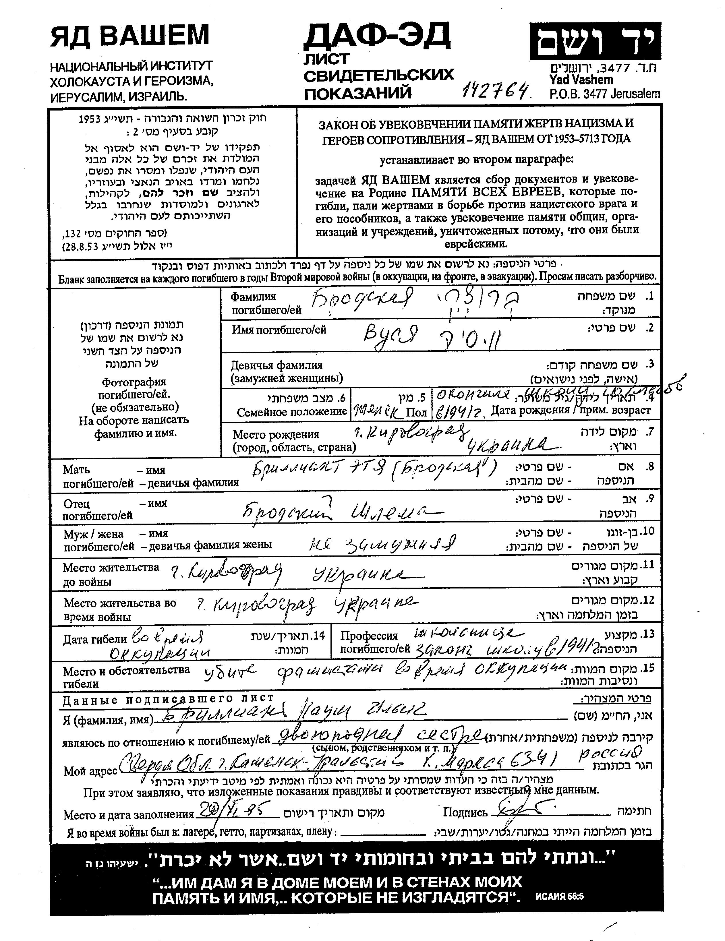 Бродски Вуся 1924 Кировоград, Украина (СССР) Лист свидетельских показаний