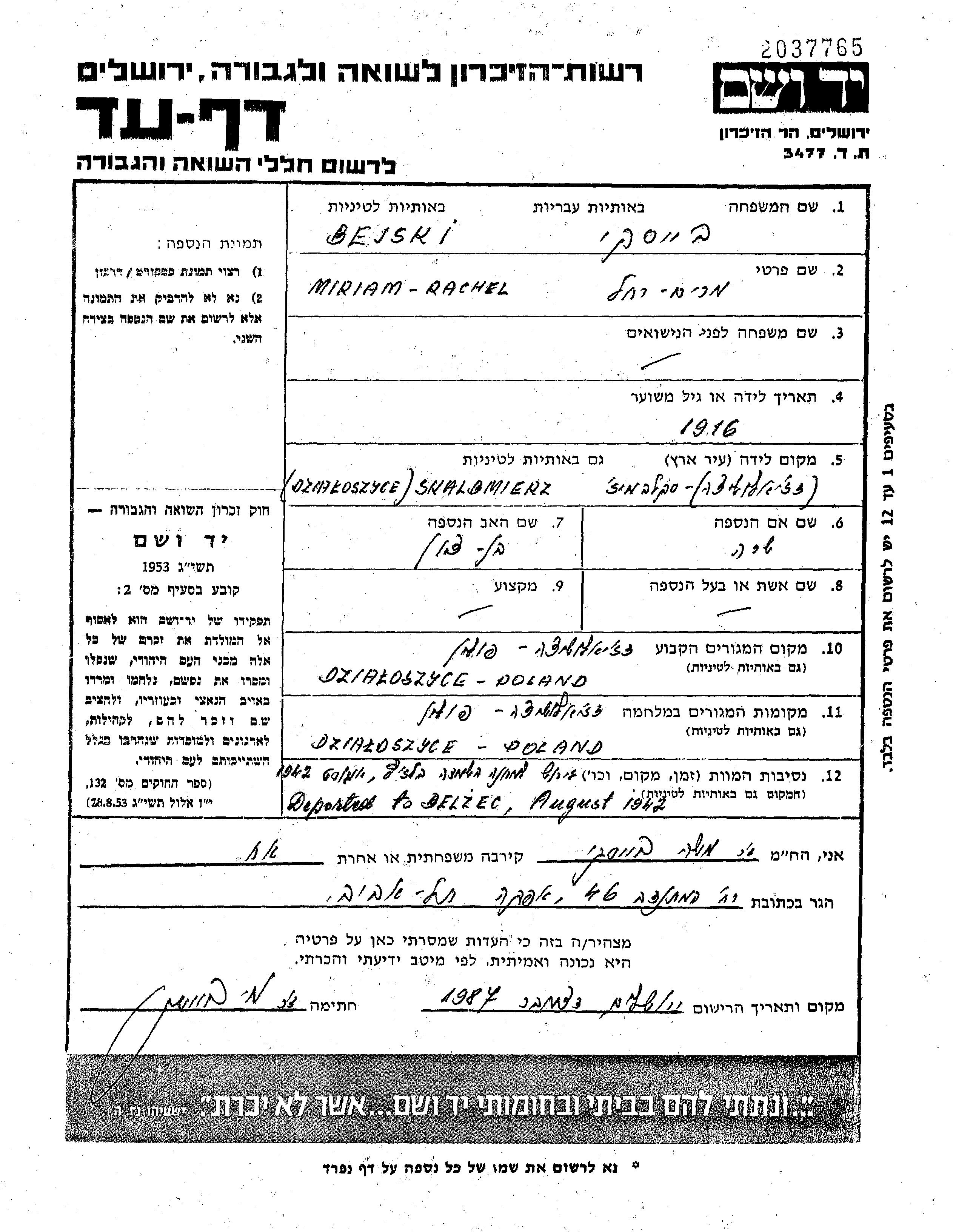 Бейски Рахель Мирьям 1916 Дзялошице, Польша Лист свидетельских показаний