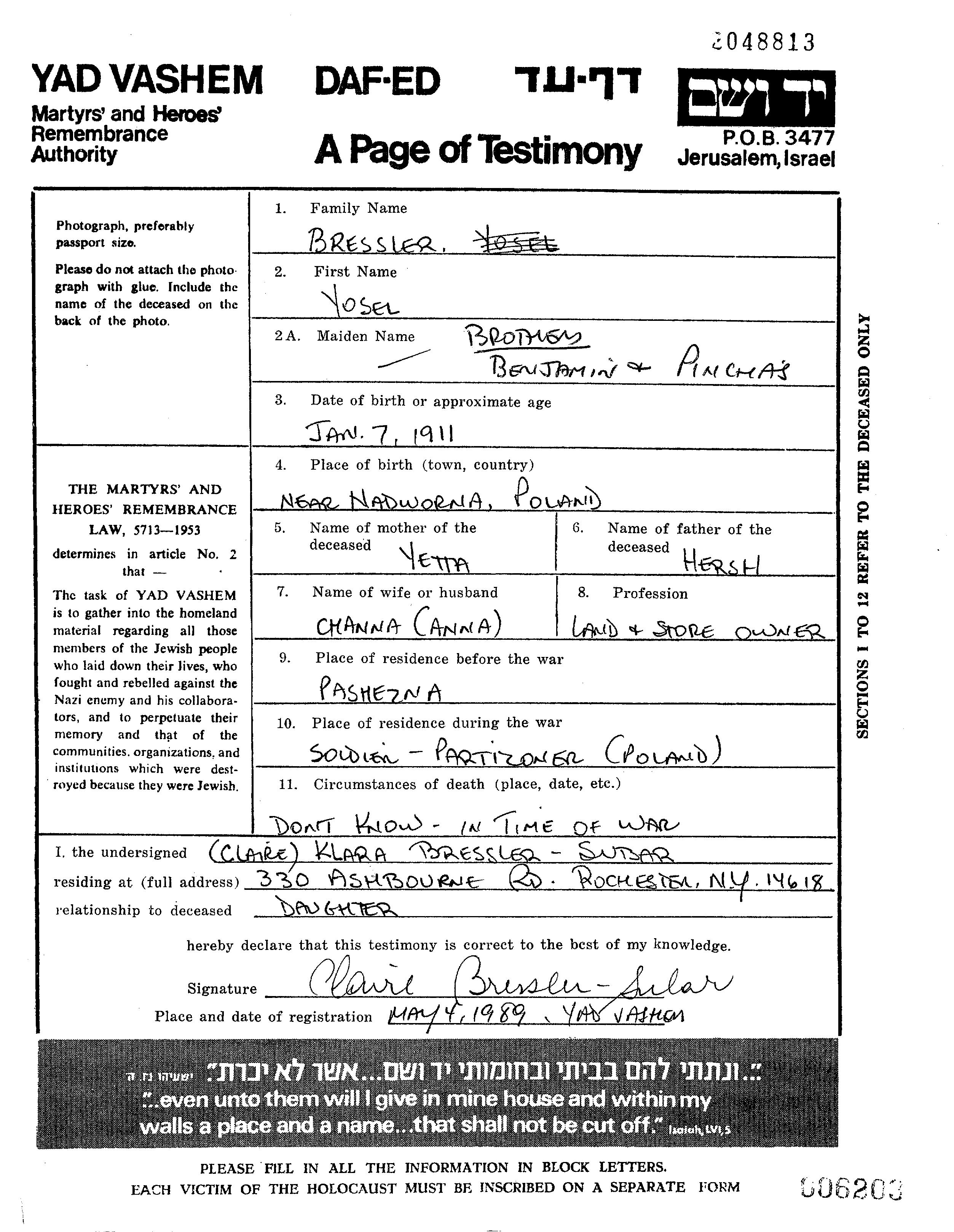 Йосел Бресслер, место рождения: Станиславув, Польша. Отец: Герш, mать:Етта. Владелец / владелица магазина. Женат / замужем. Место жительства до войны: Пасечная, Польша. Место во время войны: Польша.