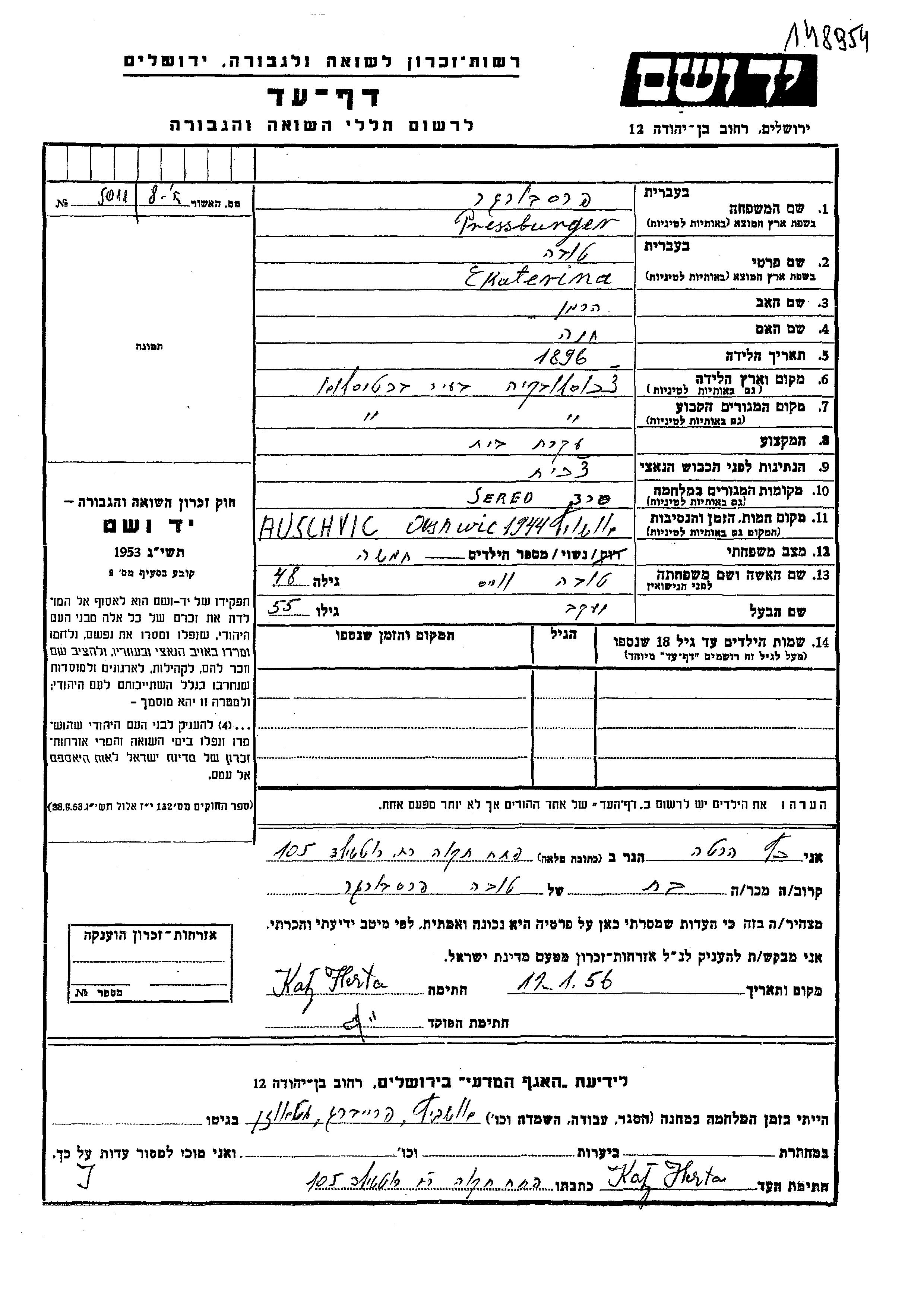 Пресбургер Кати 1896 Братислава, Чехословакия Лист свидетельских показаний