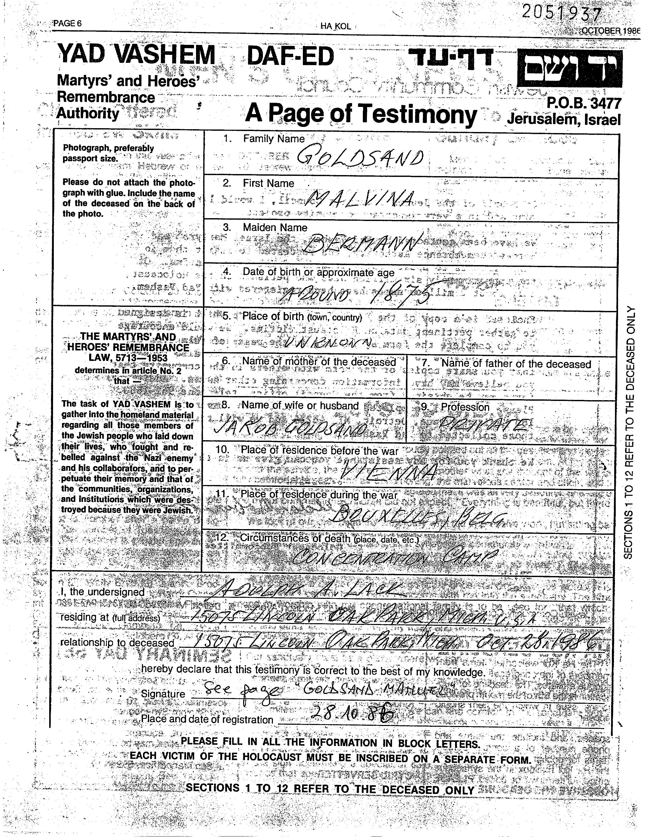 Мальвина Гольдзанд, девичья фамилия Берманн. Частный предприниматель. Женат / замужем. Место жительства до войны: Вена, Австрия. Место во время войны: Брюссель, Бельгия.