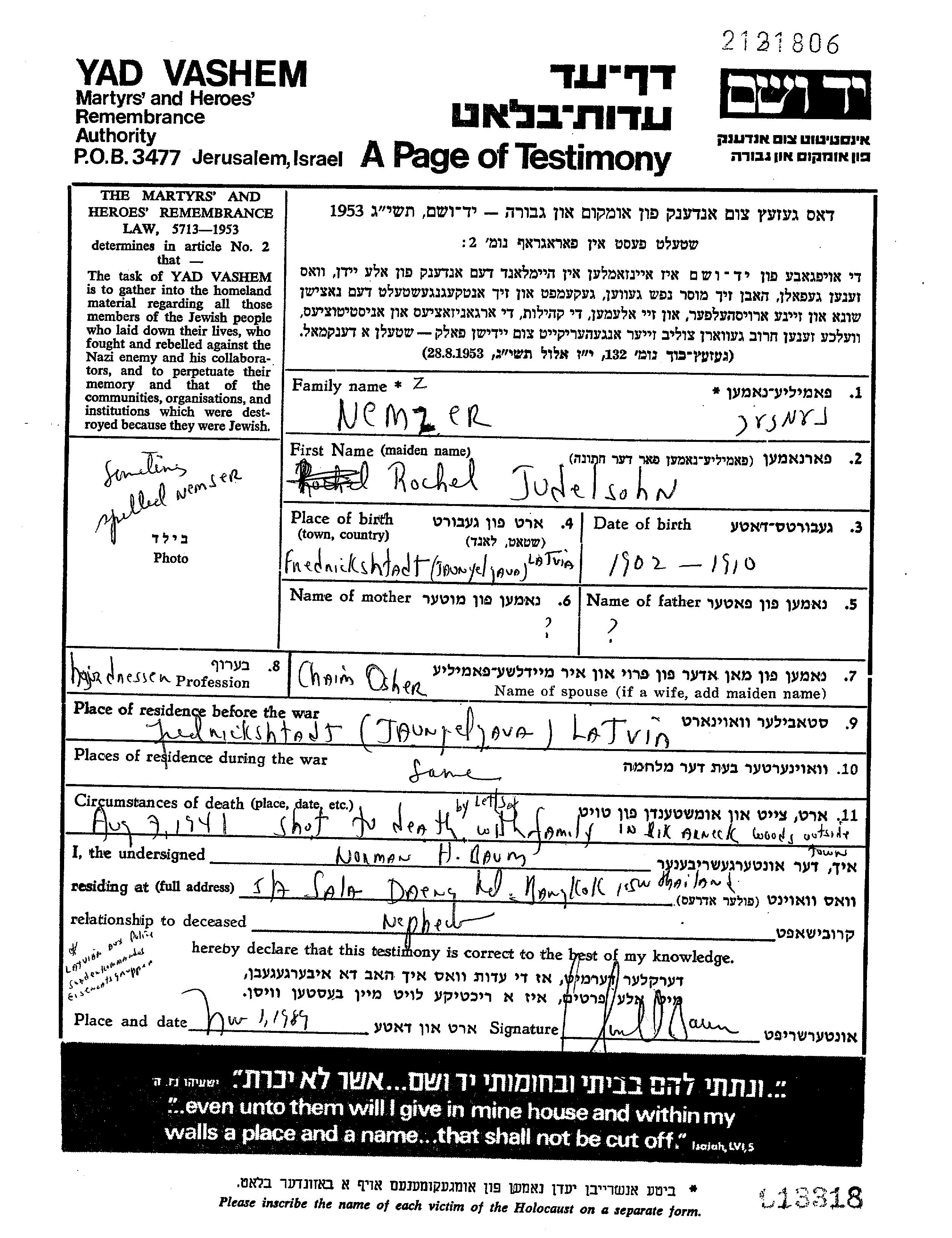 Немзер Рохель 1902 Фридрихштадт, Латвия Лист свидетельских показаний