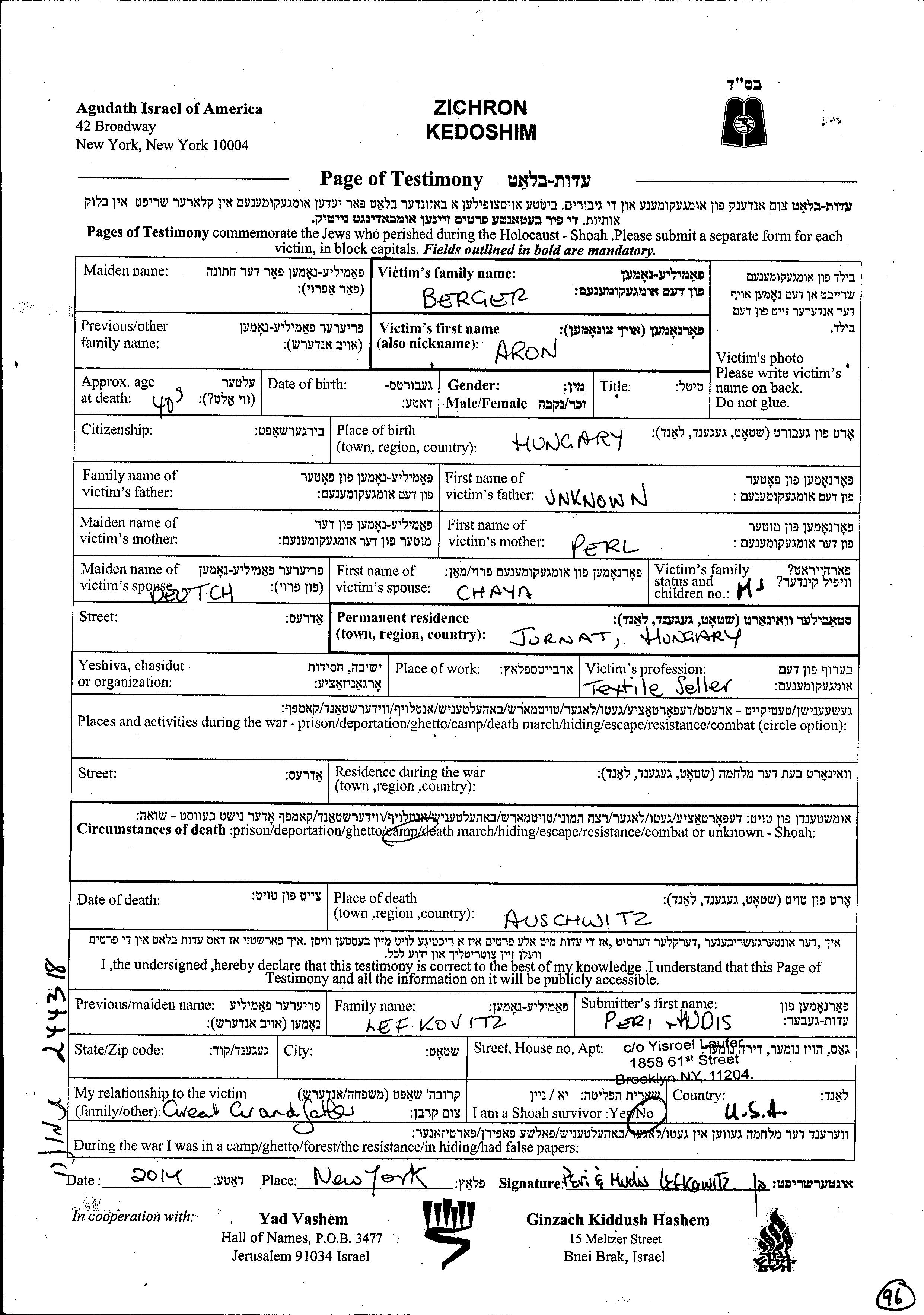 Бергер Арон Gyirmot, Венгрия Лист свидетельских показаний