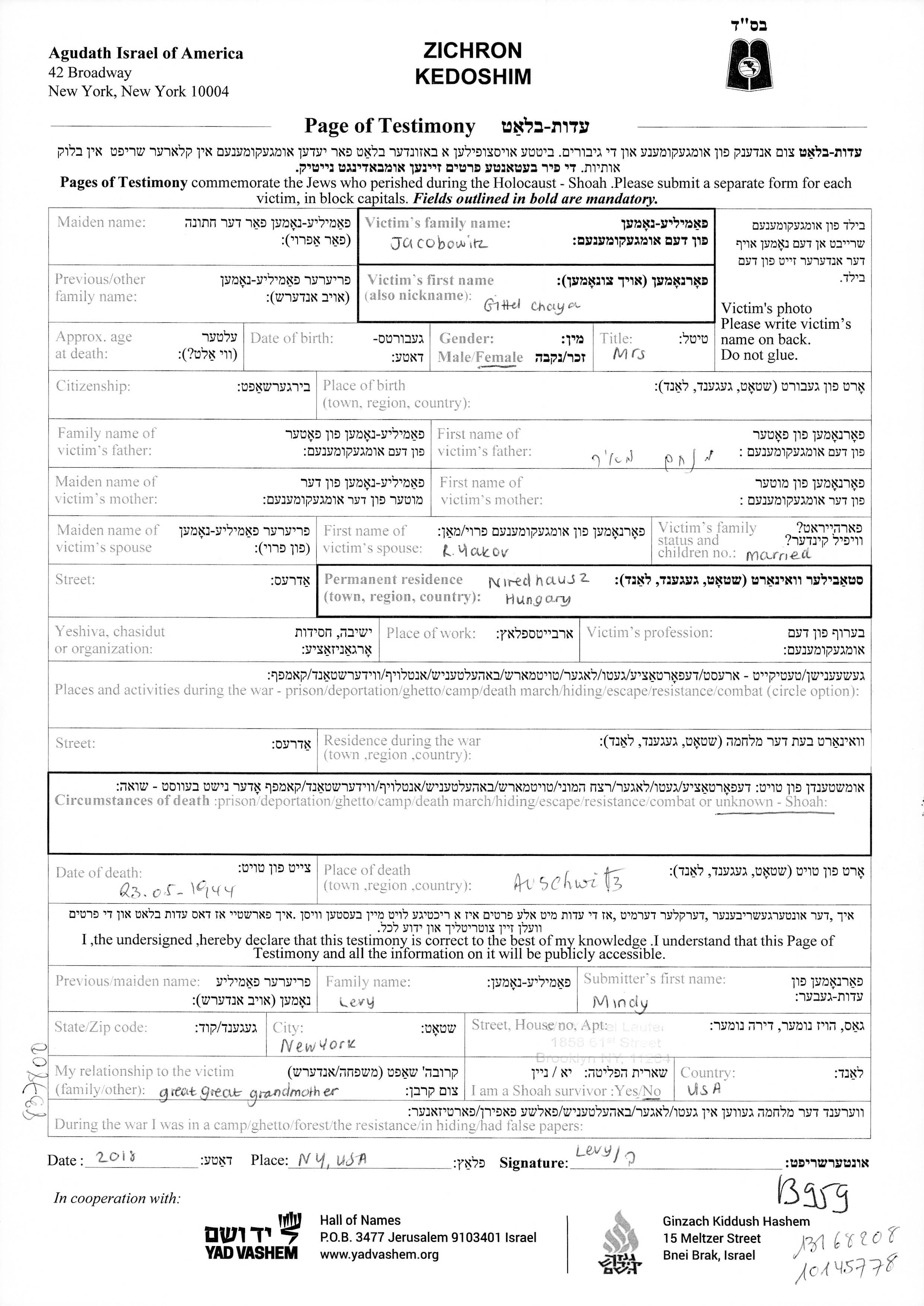 Якобовиц Гиттель Хая Ньиредьхаза, Венгрия Лист свидетельских показаний