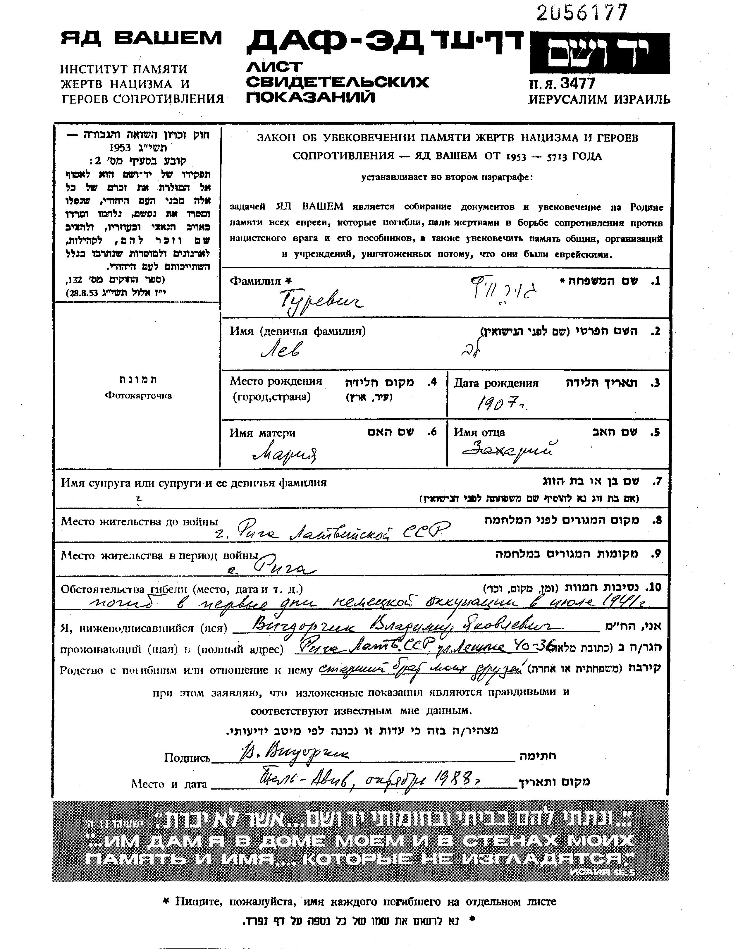 Гуревич Лев 1907 Рига, Латвия Лист свидетельских показаний