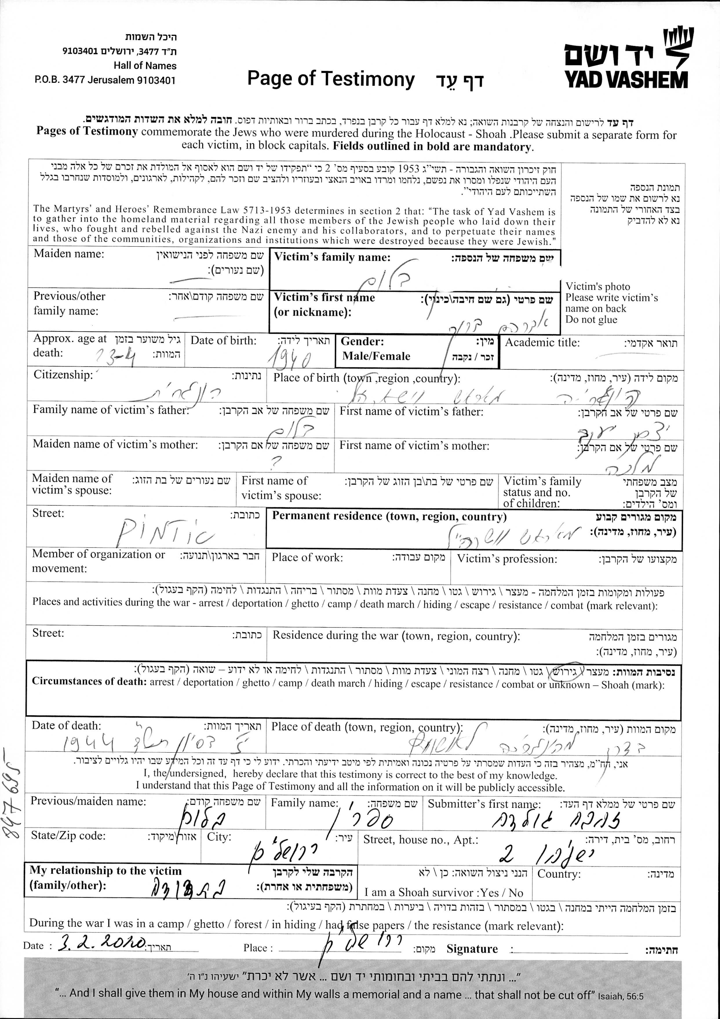 Яд Вашем - Листы свидетельских показаний Мемориального фонда