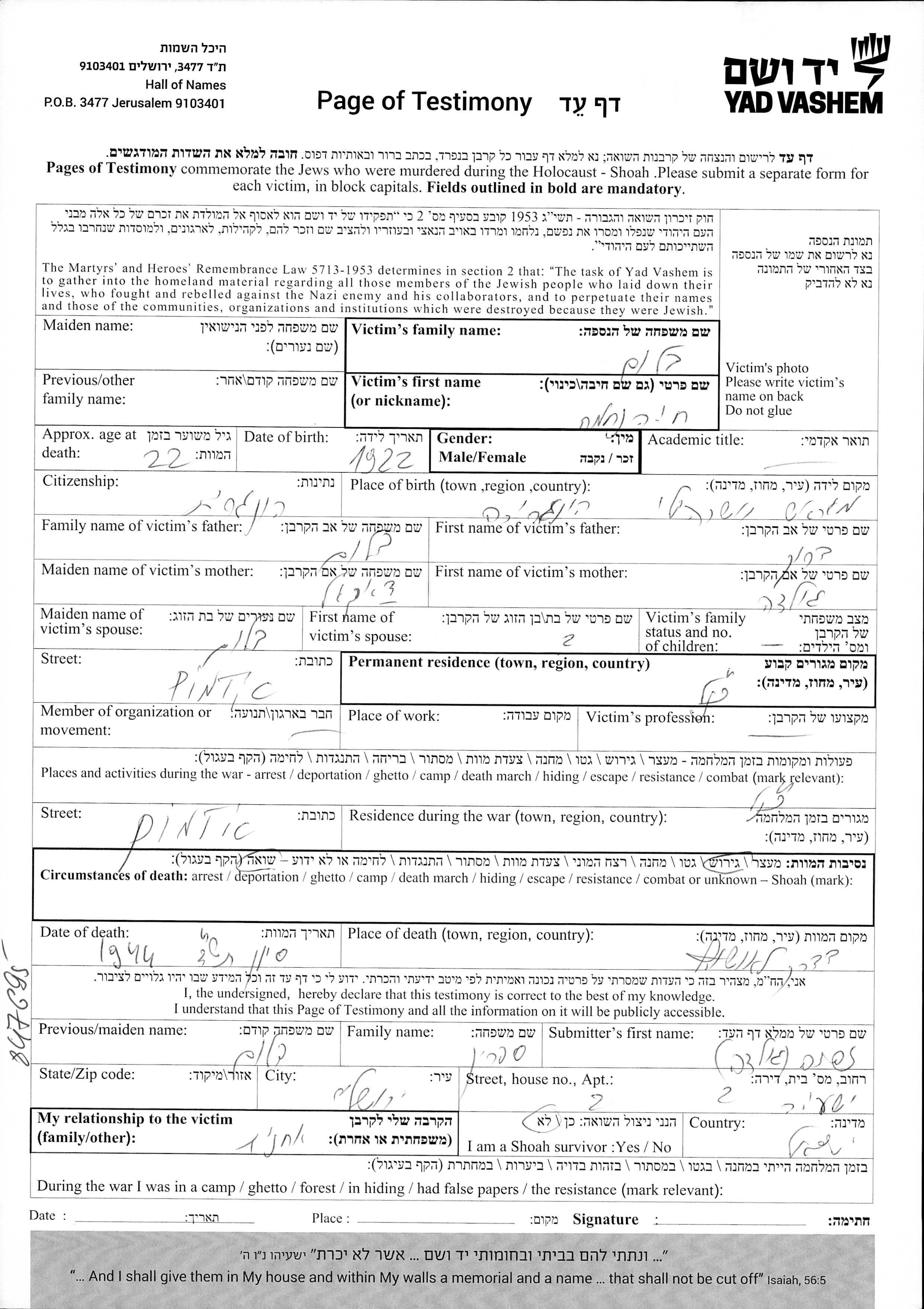 Яд Вашем - Листы свидетельских показаний Мемориального фонда