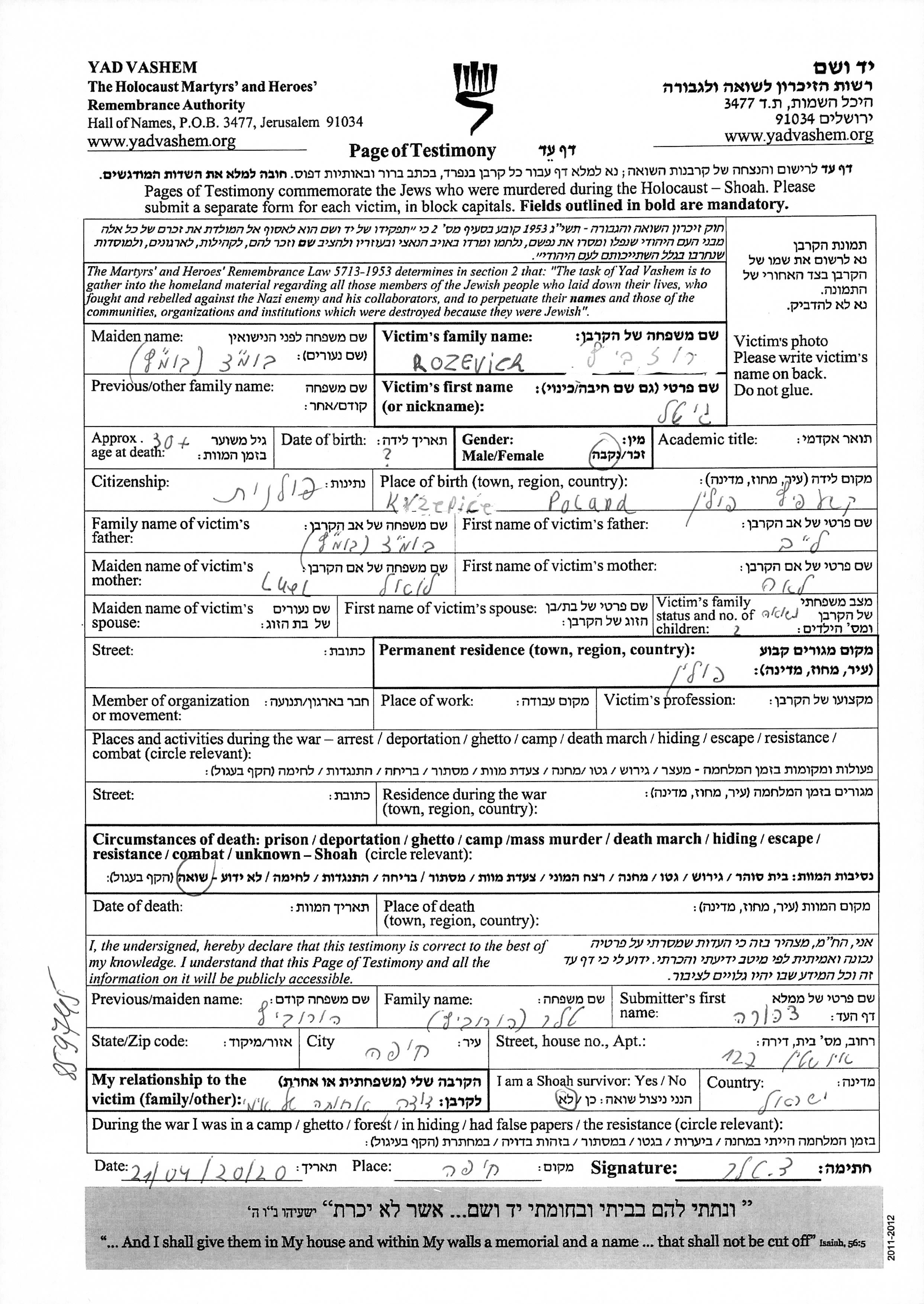 Гитель Розевич, девичья фамилия Бомац, место рождения: Кшепице, Польша. Отец: Лейб, mать:Лея, девичья фамилия Луэль. Женат / замужем. Место жительства до войны: Польша.