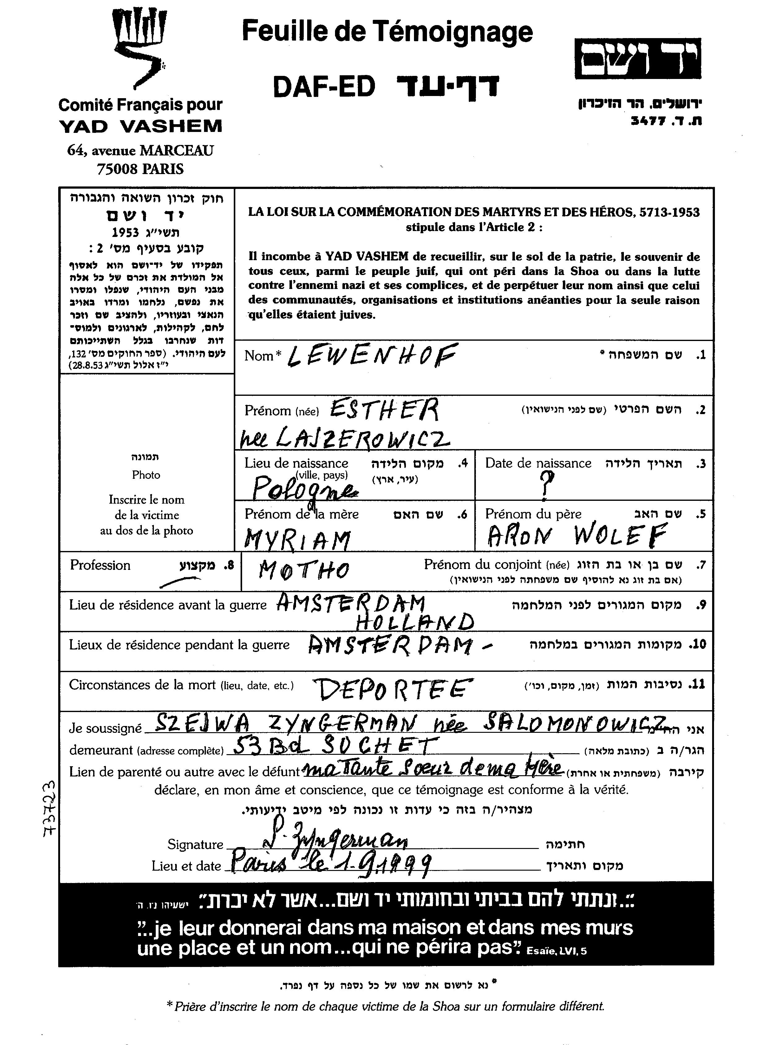 Эстер Левенхоф, девичья фамилия Лайзерович, место рождения: Польша. Место жительства до войны: Амстердам, Нидерланды.