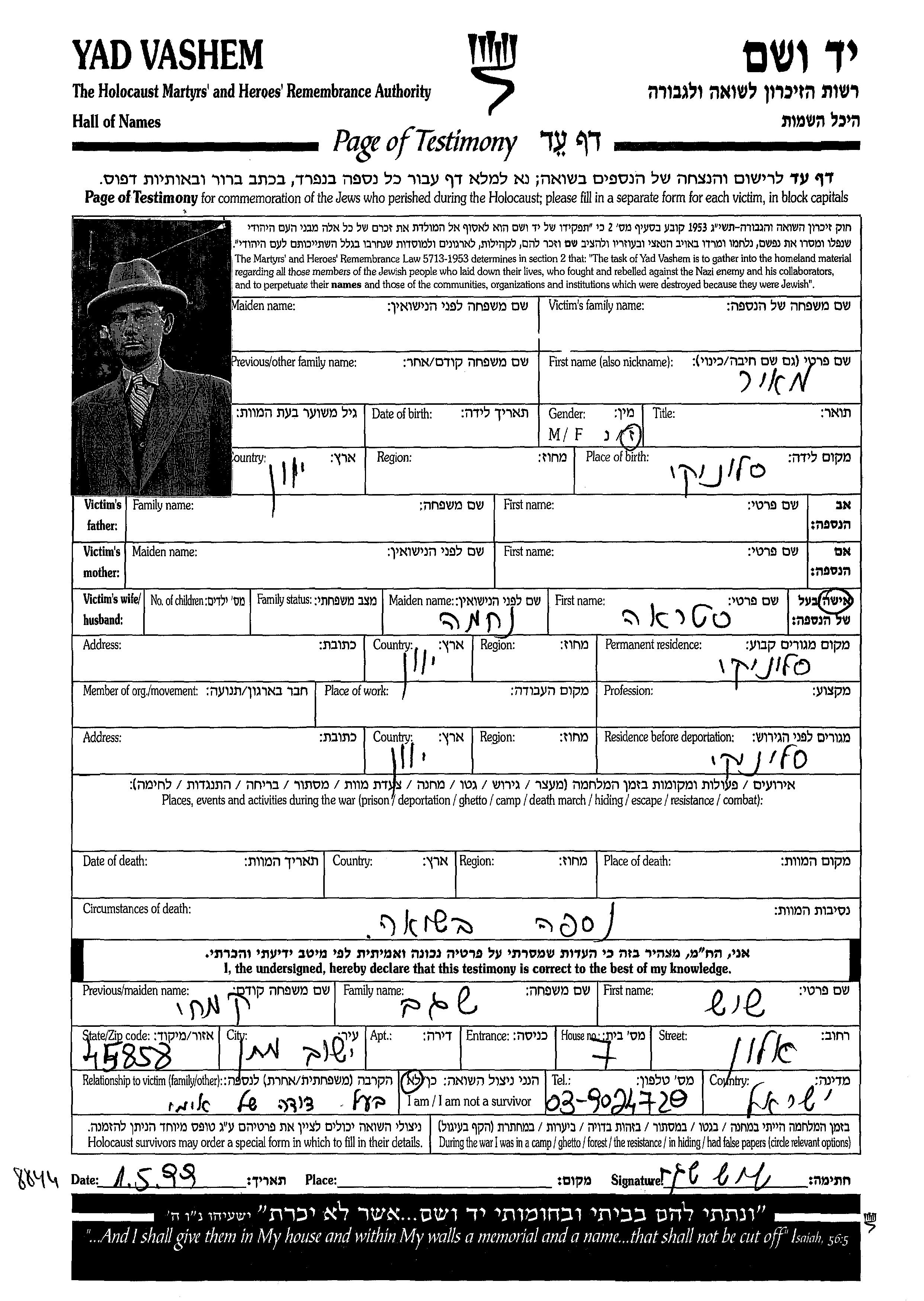 Фамилия неизвестна Меир Салоники, Греция Лист свидетельских показаний