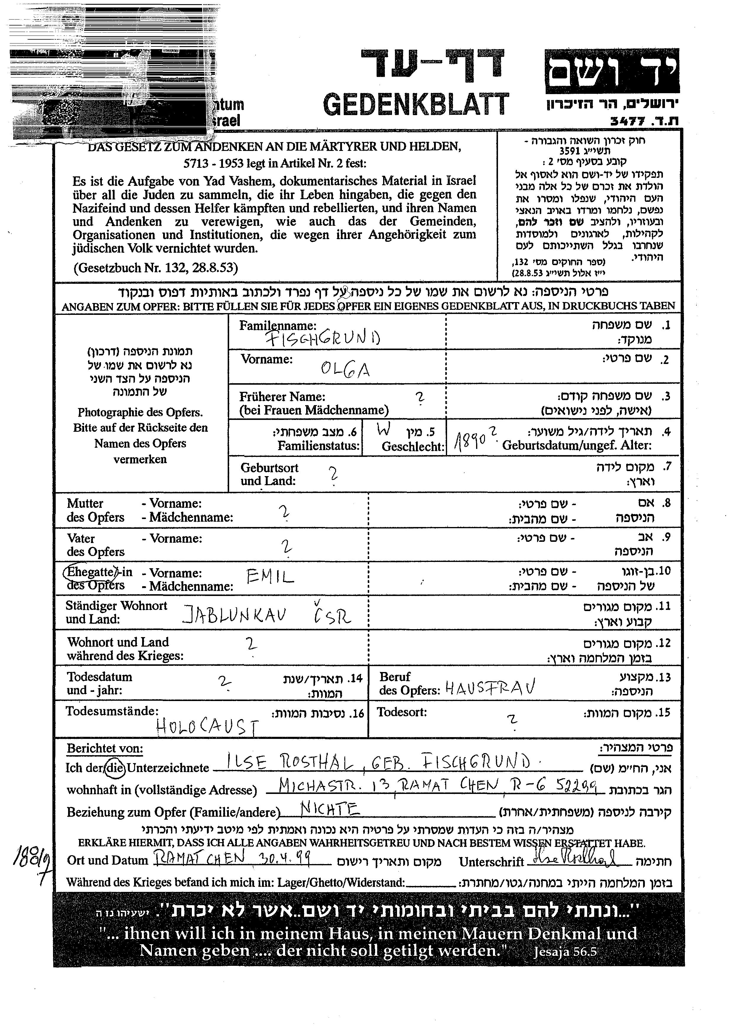 Фишгрунд Ольга 1890 Яблункау, Чехословакия Лист свидетельских показаний