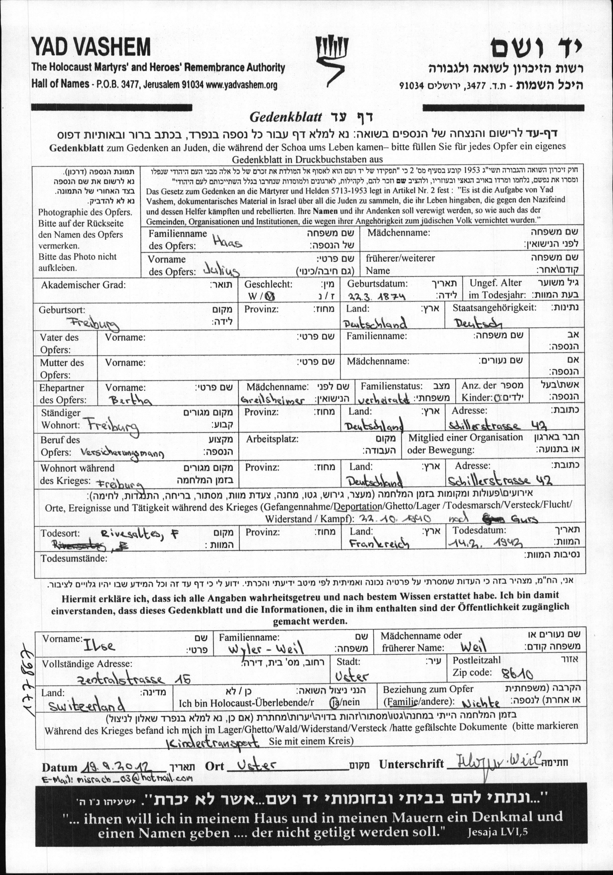 Юлиус Хаас, место рождения: Фрейбург, Германия. Versicherungsagent. Место жительства до войны: Фрейбург, Германия.