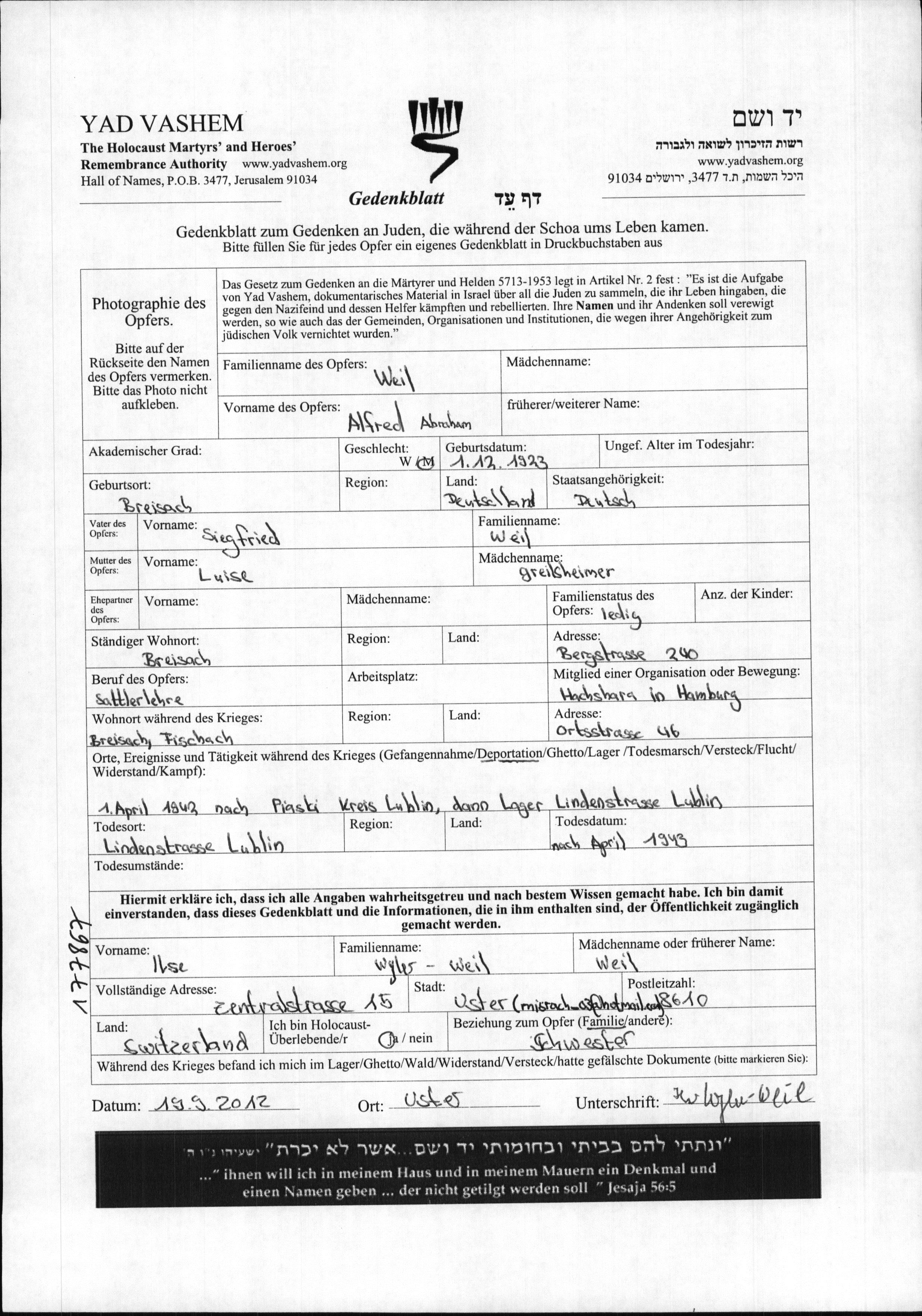 Альфред Абраам Вайль, место рождения: Брейзах, Германия. Кожевник. Место жительства до войны: Брейзах, Германия.