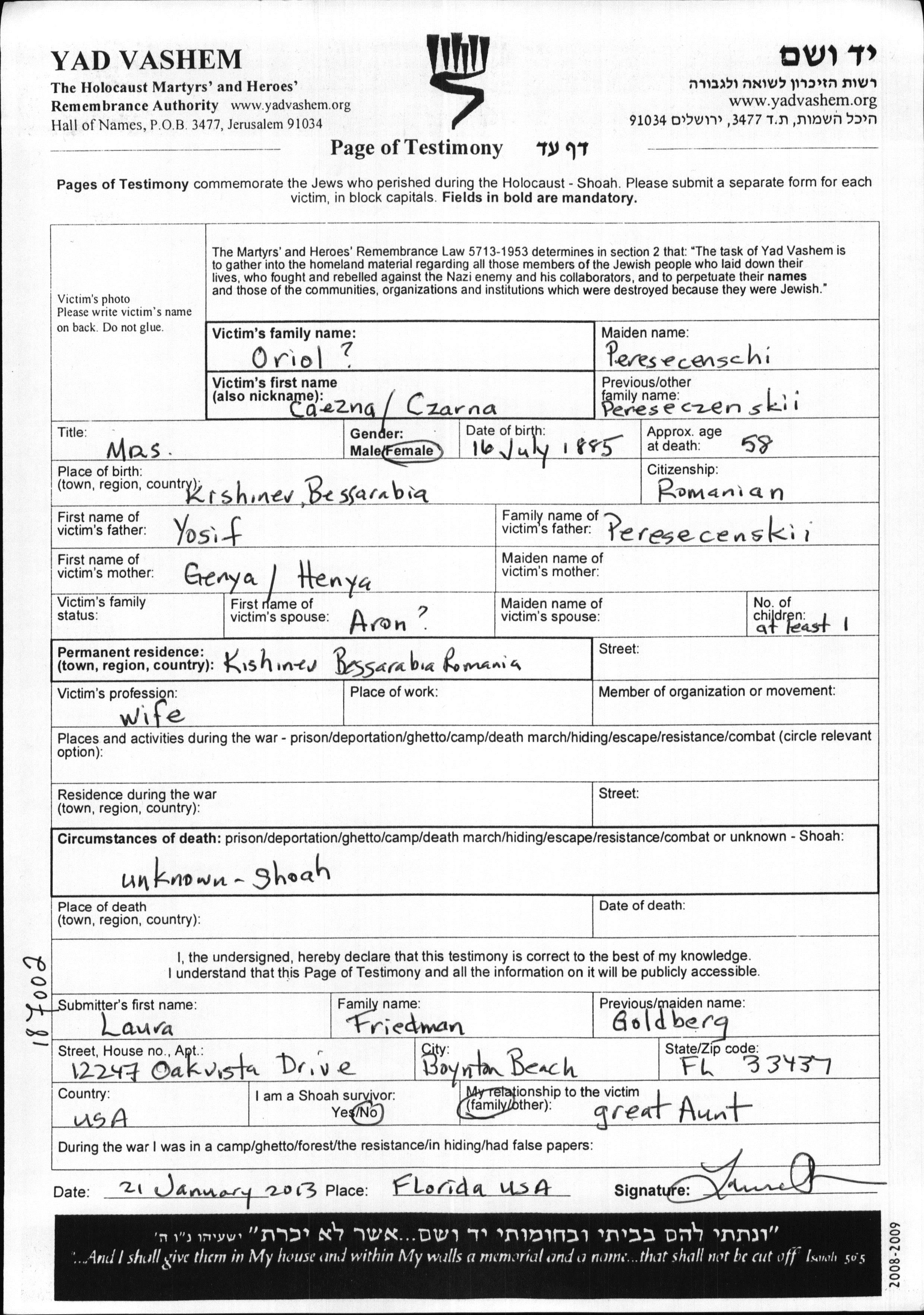 Чарна Орёл, девичья фамилия Пересеченски, место рождения: Кишинёв, Румыния. Домохозяйка. Место жительства до войны: Кишинёв, Румыния.