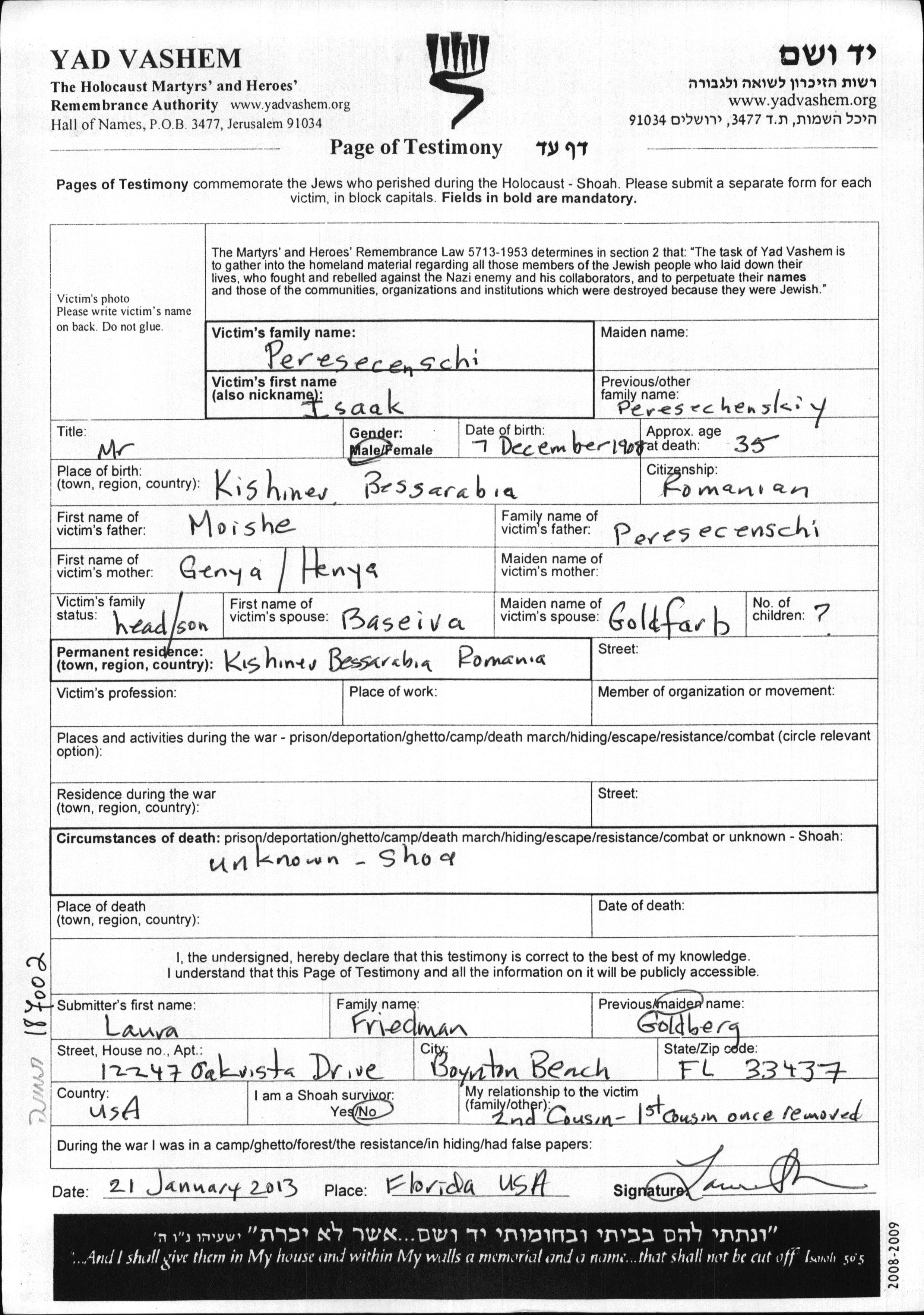 Пересеченски Исаак 1908 Кишинёв, Румыния Лист свидетельских показаний