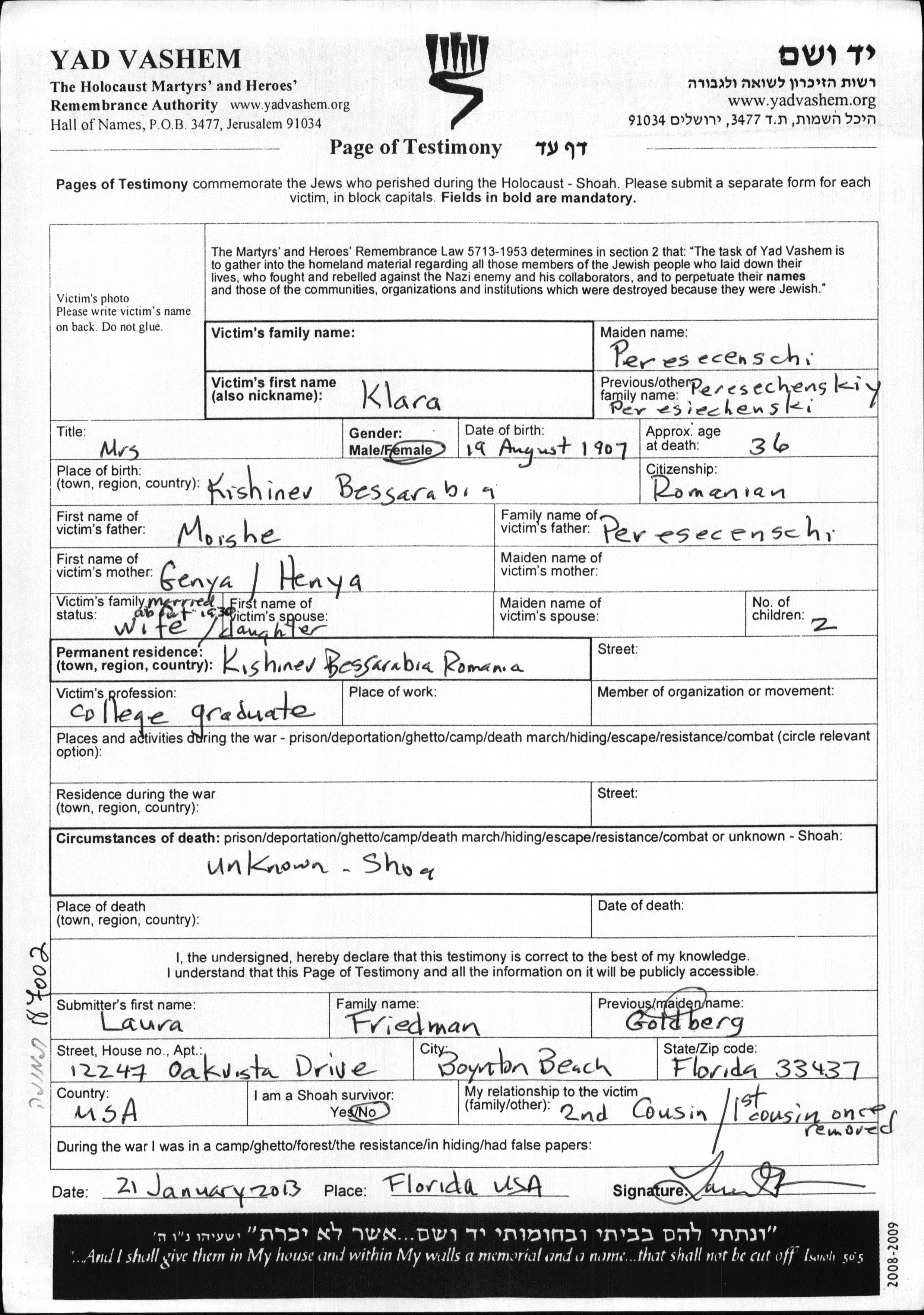 Фамилия неизвестна Клара 1907 Кишинёв, Румыния Лист свидетельских показаний