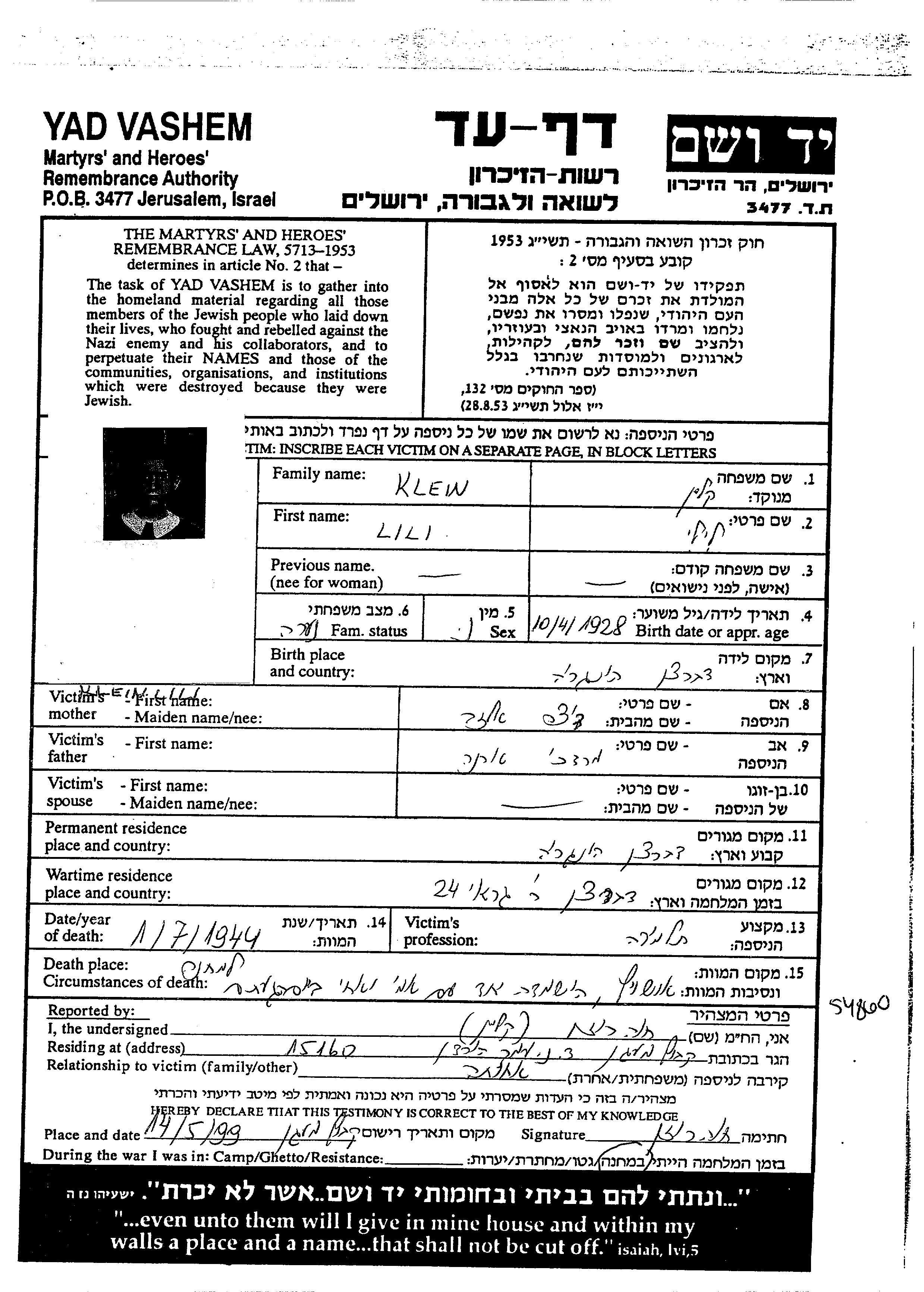 Клейн Лили 1928 Дебрецен, Венгрия Лист свидетельских показаний