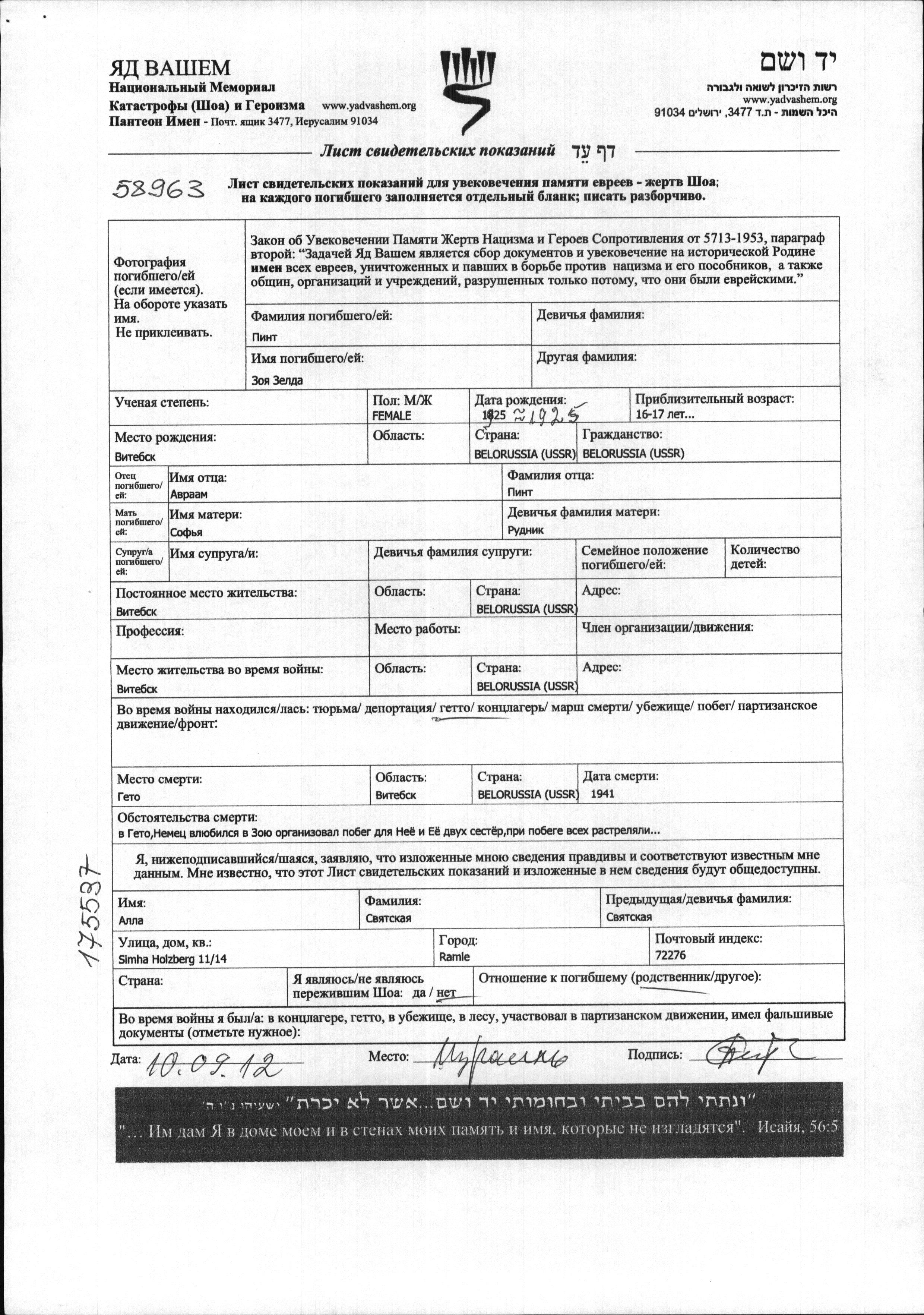 Пинт Зоя Зельда 1925 Витебск, Белоруссия (СССР) Лист свидетельских показаний (электронный, с подписью)