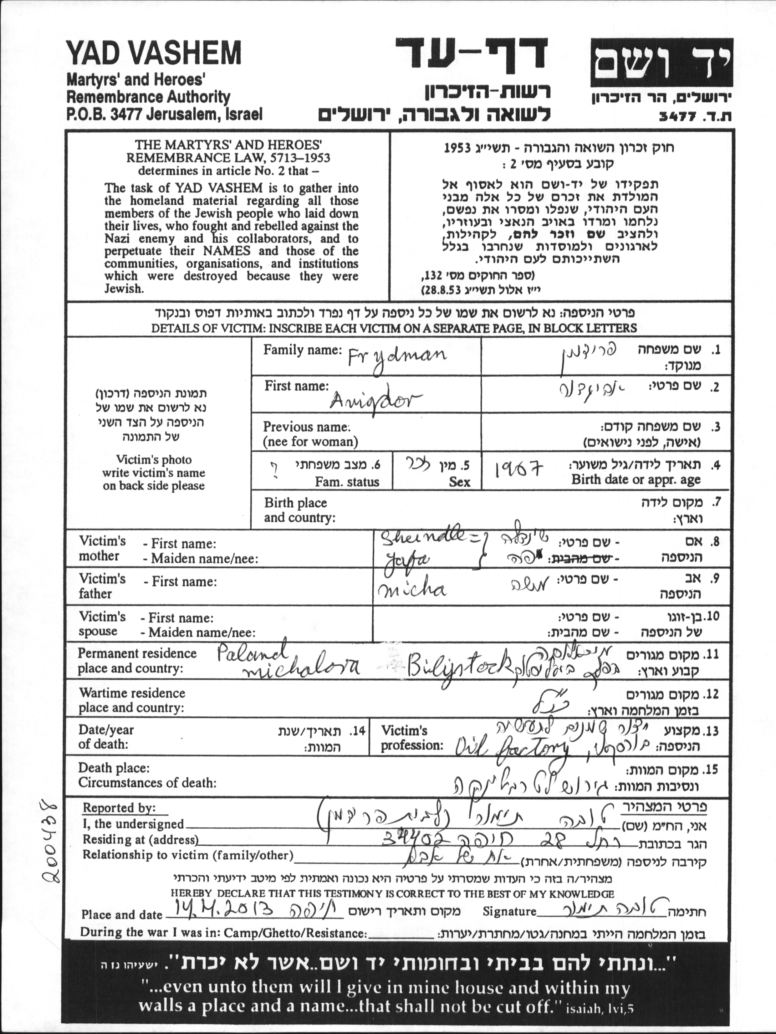 Фридман Авигдор 1907 Белосток, Польша Лист свидетельских показаний