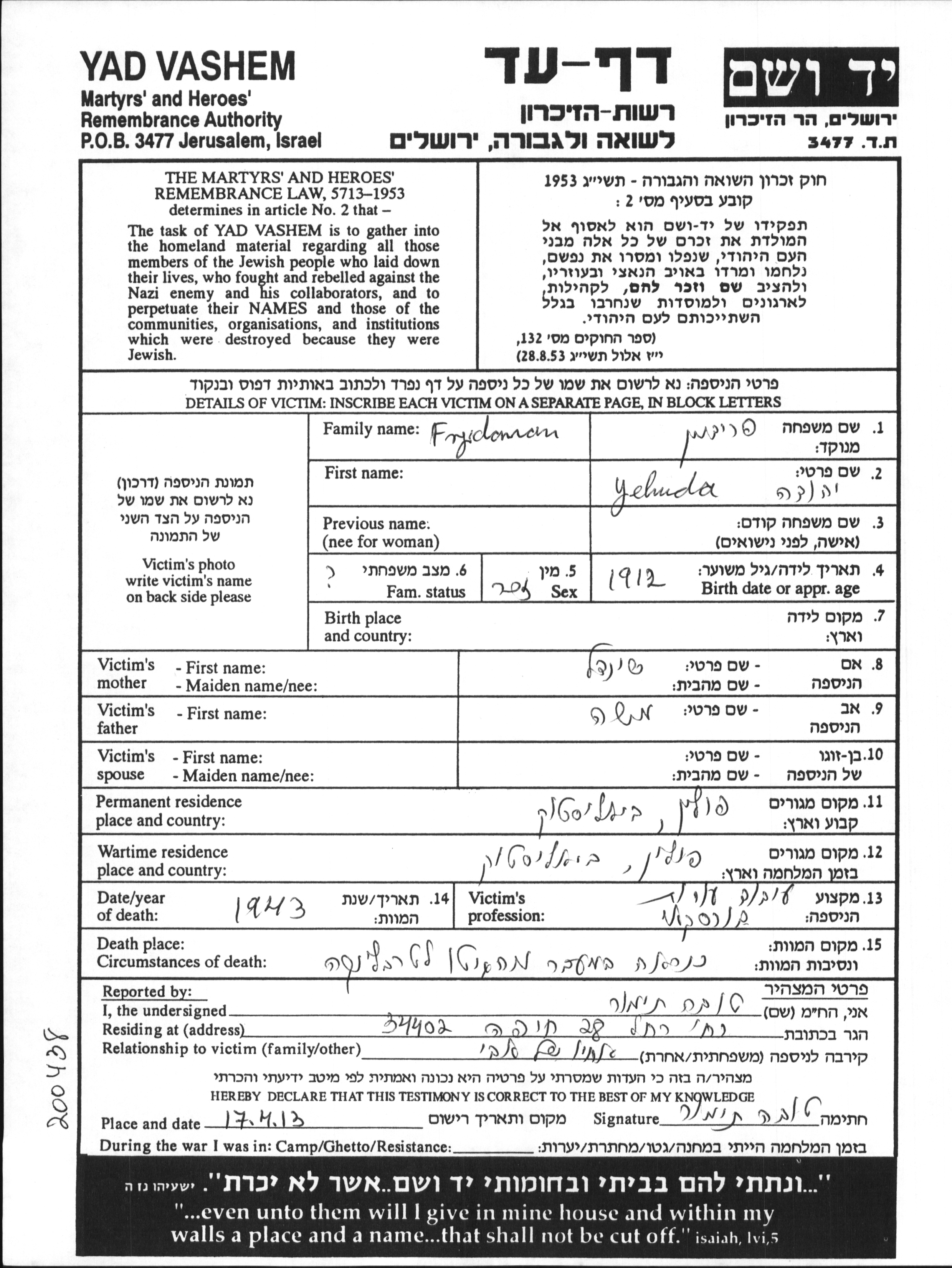 Фридман | Иегуда | 1912 | Белосток, Польша | Лист свидетельских показаний |