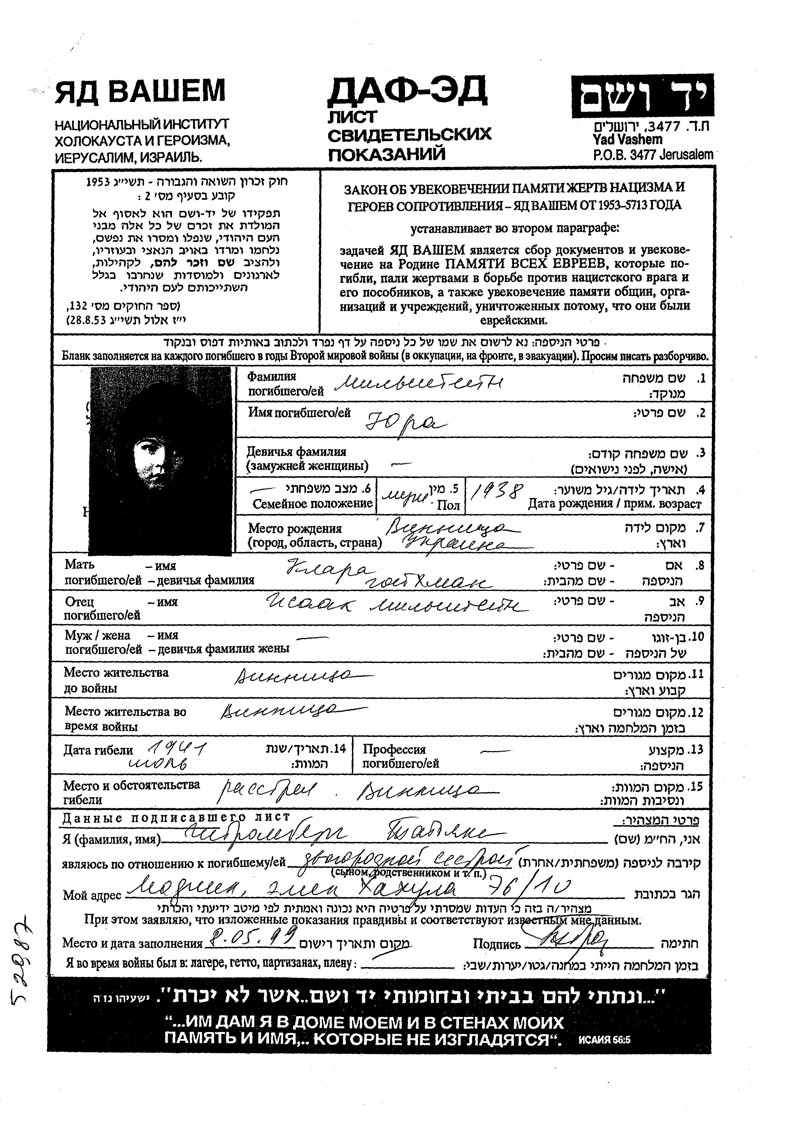 Мильштейн Юра 1938 Винница, Украина (СССР) Лист свидетельских показаний