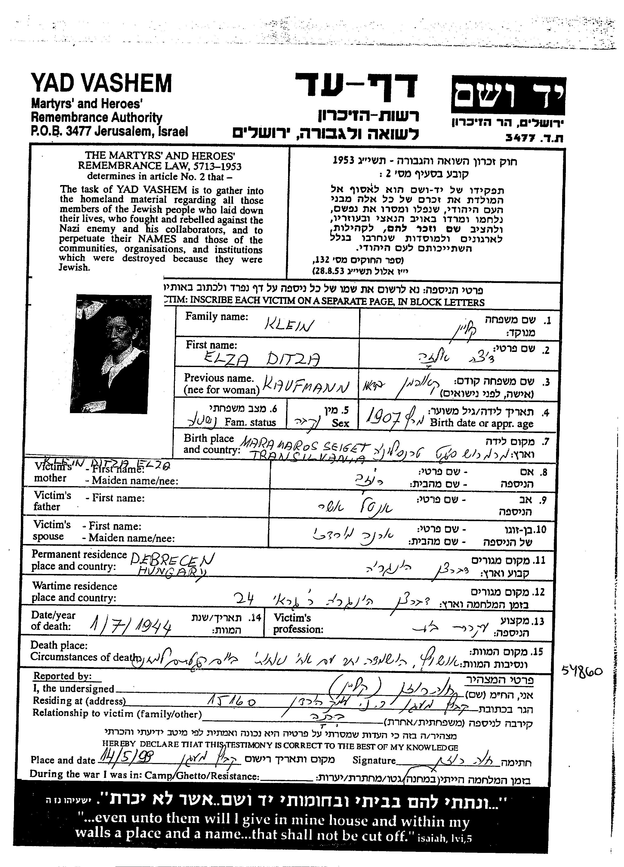 Клейн | Эльза Дица | 1907 | Дебрецен, Венгрия | Лист свидетельских показаний |