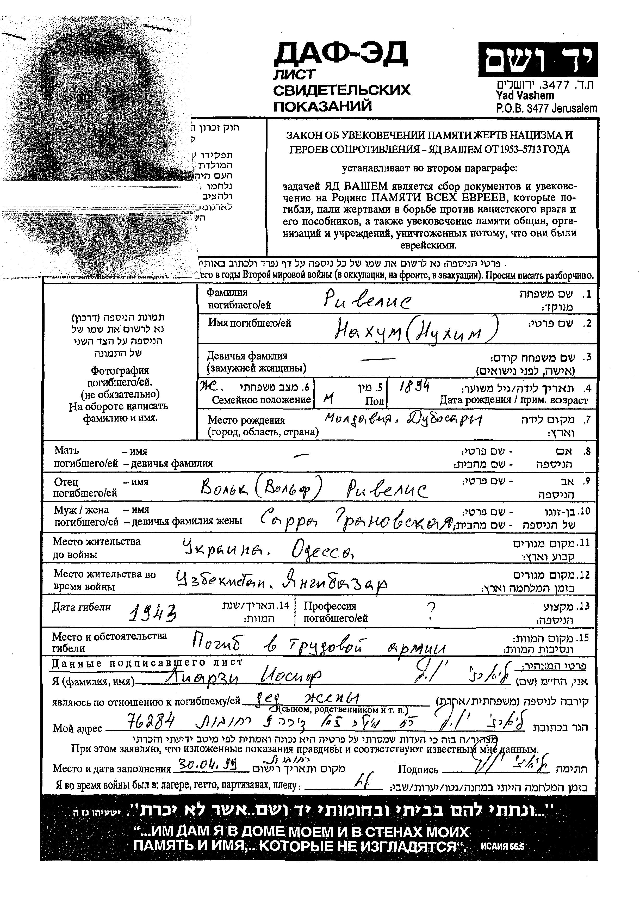 Ривелис Нахум 1894 Одесса, Украина (СССР) Лист свидетельских показаний