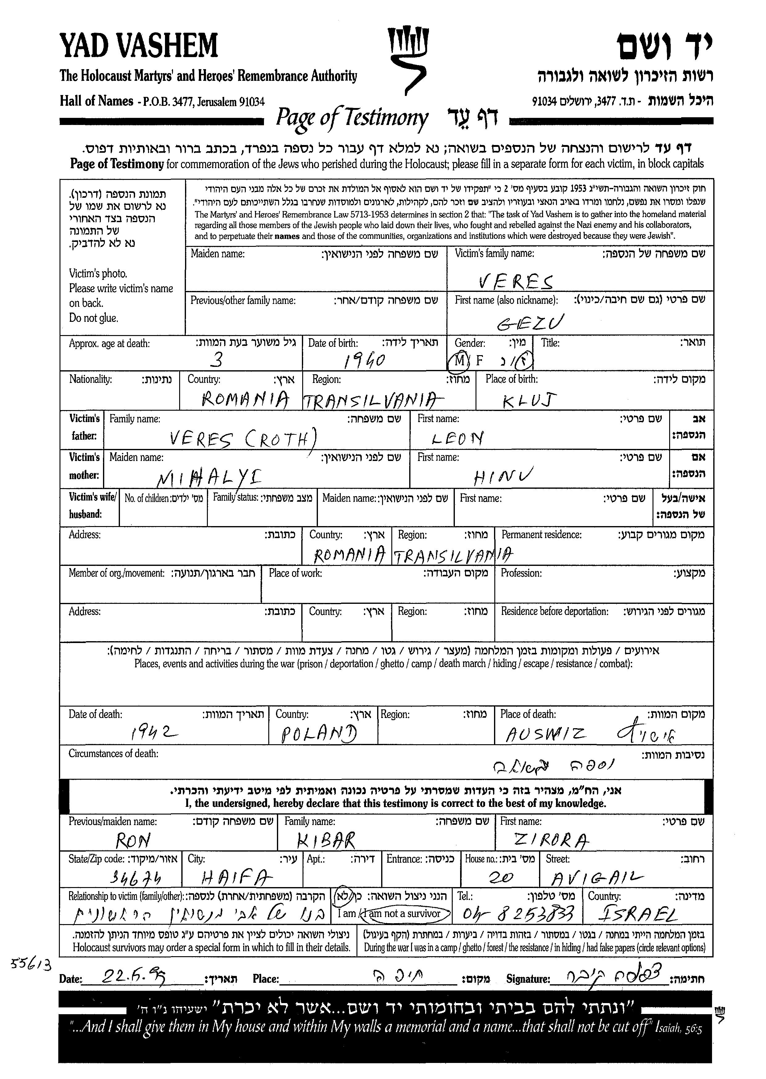 Гезу Вереш, место рождения: Клуж, Румыния. Место жительства до войны: Трансильвания, Румыния.