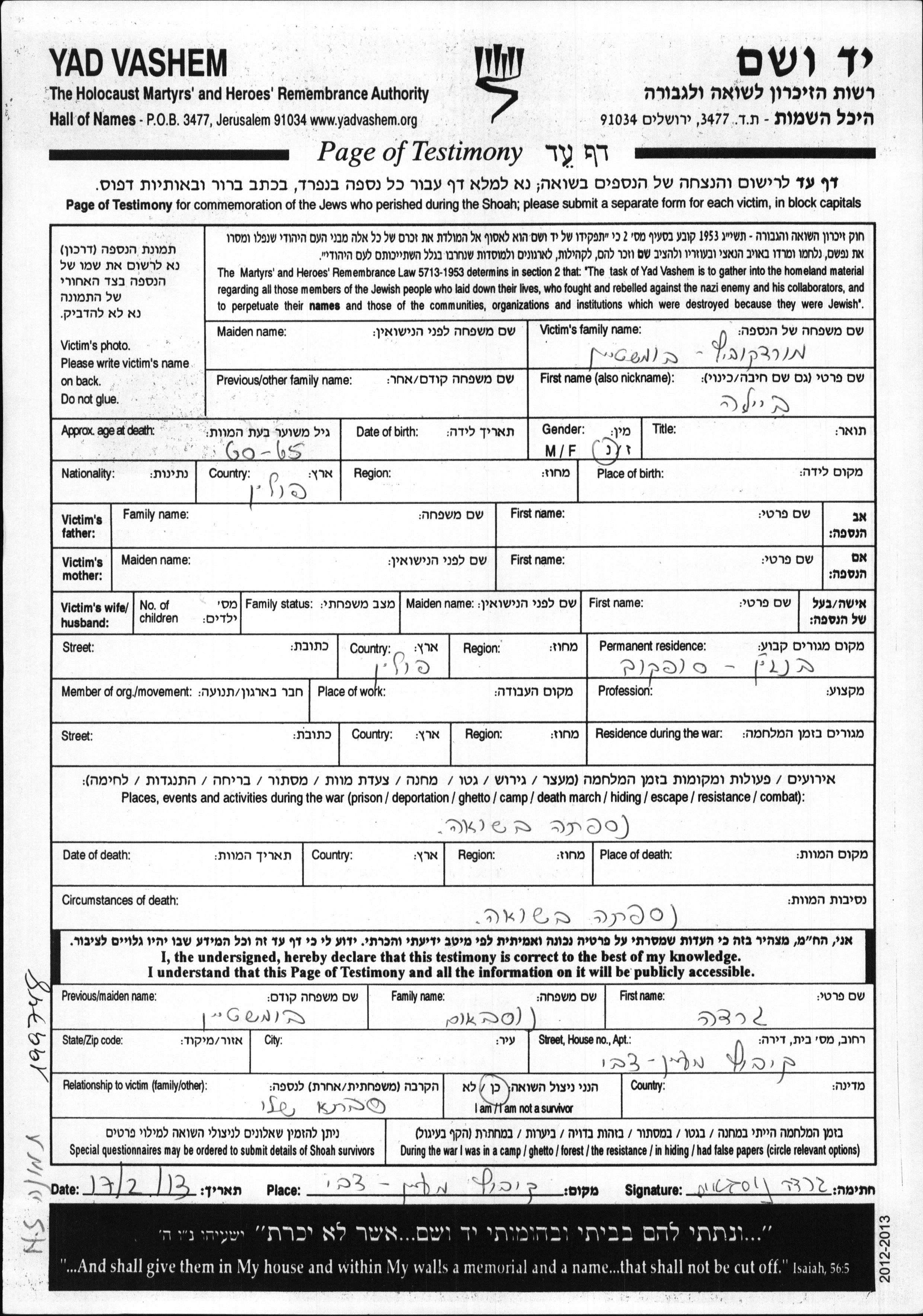 Яд Вашем - Листы свидетельских показаний Мемориального фонда