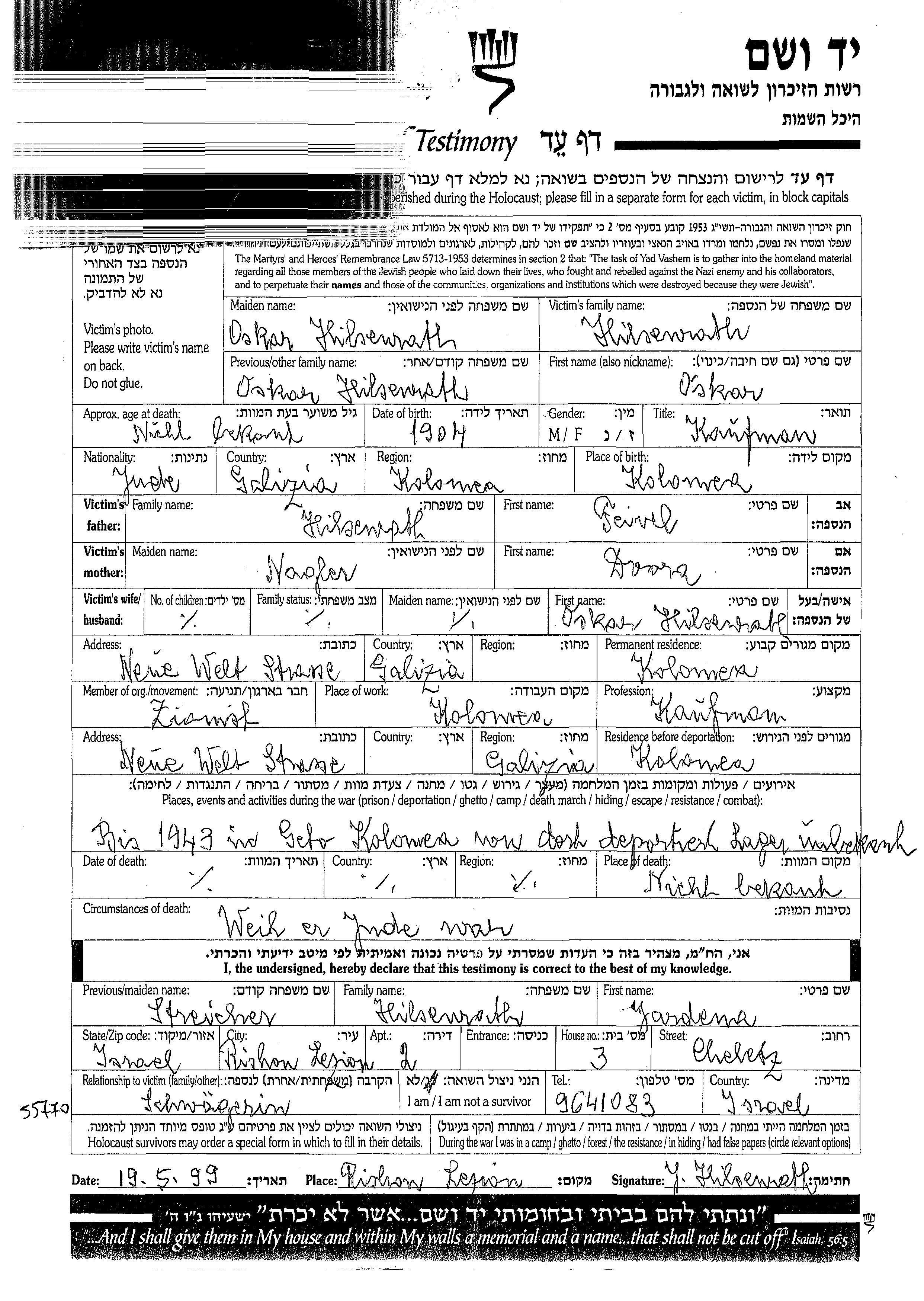 Хильсенрат | Оскар | 1904 | Коломыя, Польша | Лист свидетельских показаний |